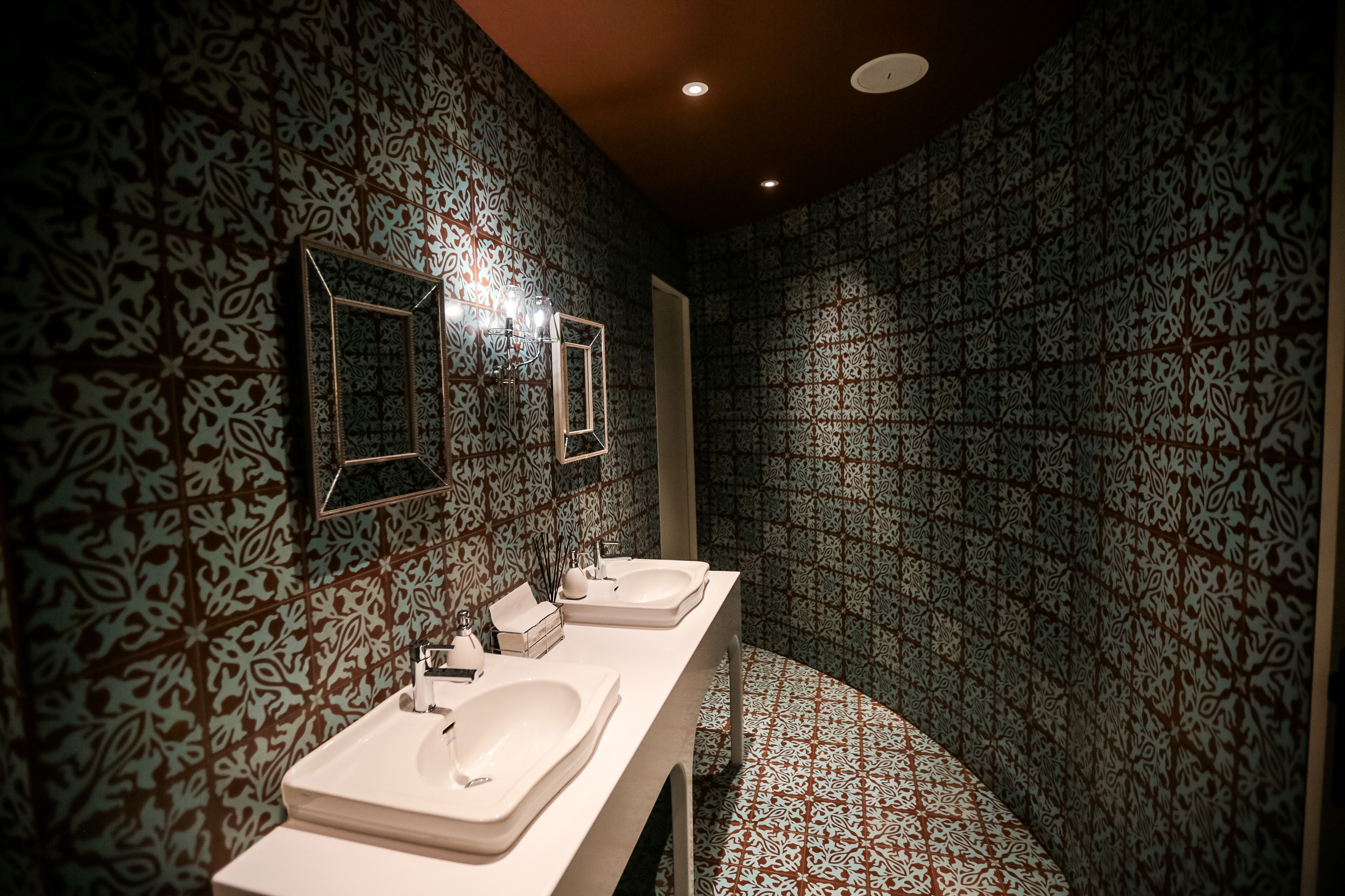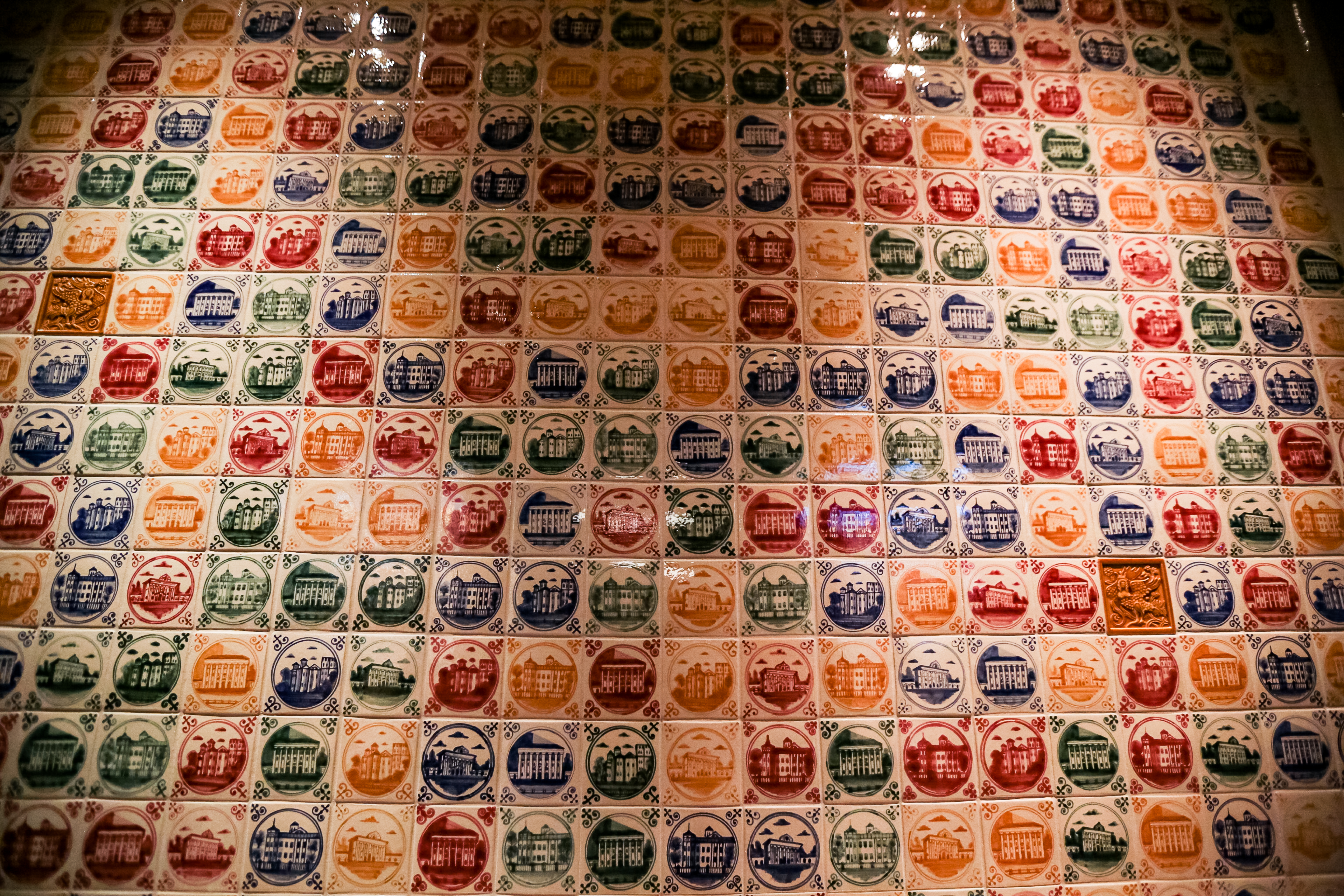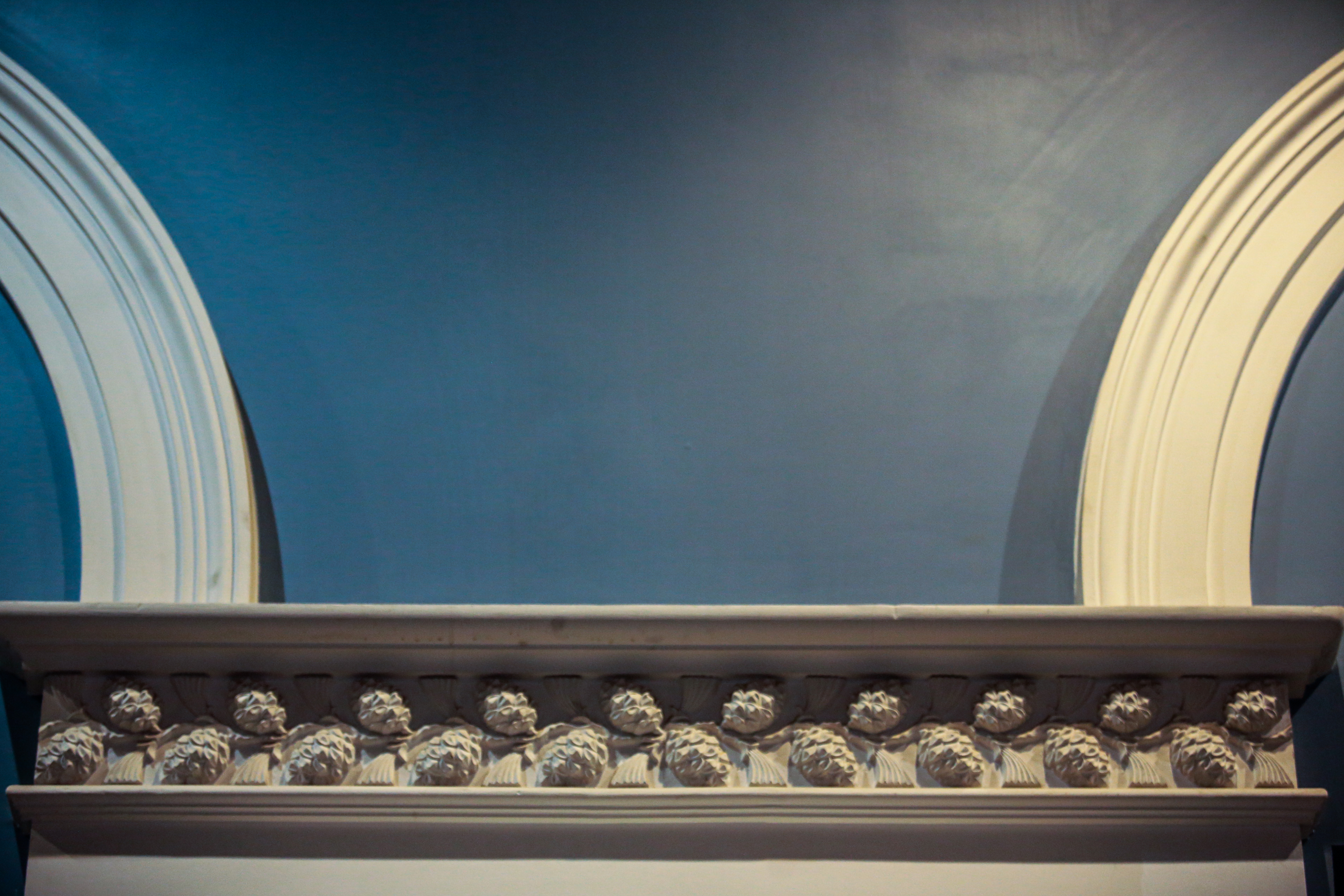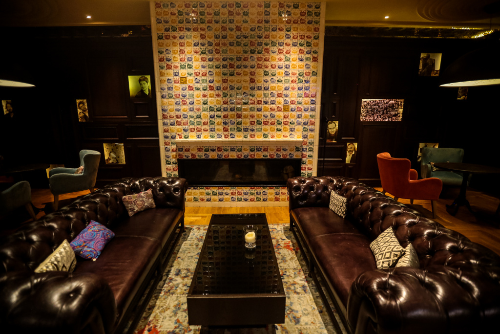 На втором этаже в зале приёмов есть большой камин. Он облицован изразцами с изображением кинотеатра в разные его годы — от символического романтизма до сталинского ампира.