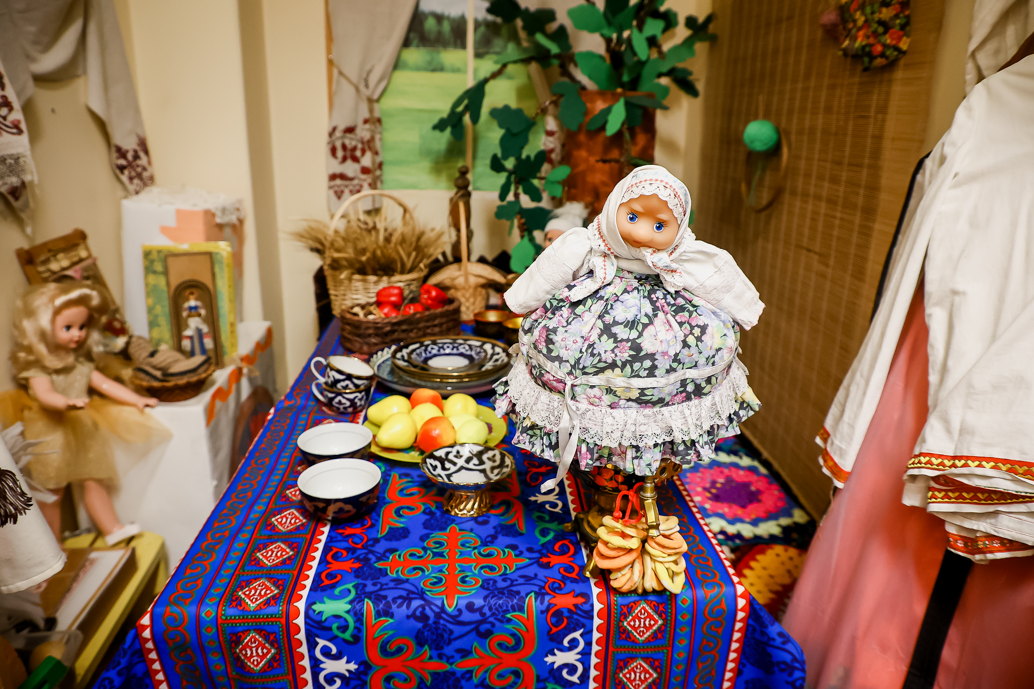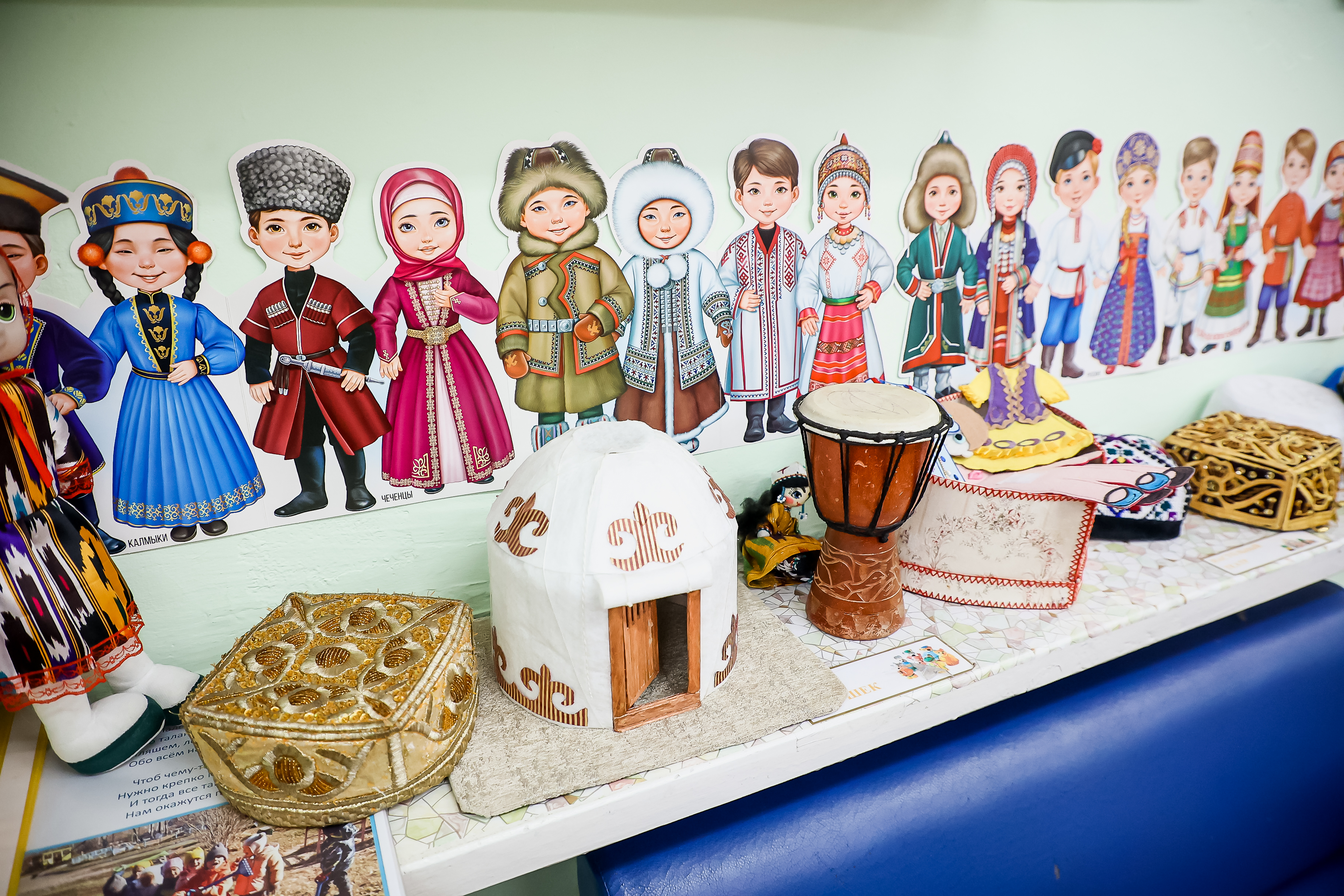 Примечательно, что после каждого занятия или утренника родители оставляли что-то на память — расписной костюм или посуду, иногда даже старинную. В итоге удалось насобирать на целый музей. Кроме того, в каждой группе оборудован уголок с национальной одеждой и аксессуарами, которые дети могут рассмотреть и примерить во время игр. Ценность этих костюмов в том, что они сшиты руками простых мастериц, в настоящих традиционных семьях.