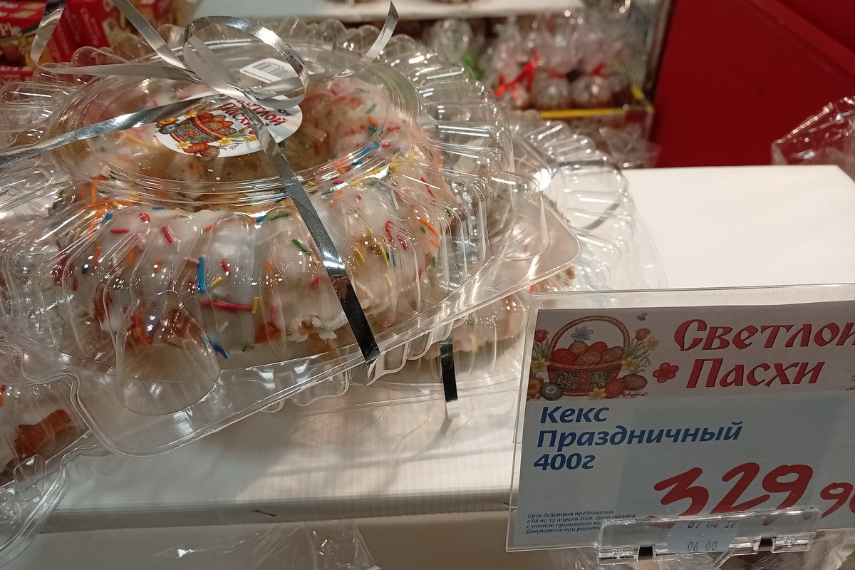 Также на страстной неделе в новосибирских магазинах повсеместно появились пасхальные шоколадные кексы. В сети «Быстроном» такое изделие массой 400 г стоит 330 рублей. Кроме выпечки с какао, пекарня магазина предлагает и творожные кексы с цукатами за 300 рублей, маковый кулич за 329 рублей и традиционный кулич массой 250 г за 200 рублей.