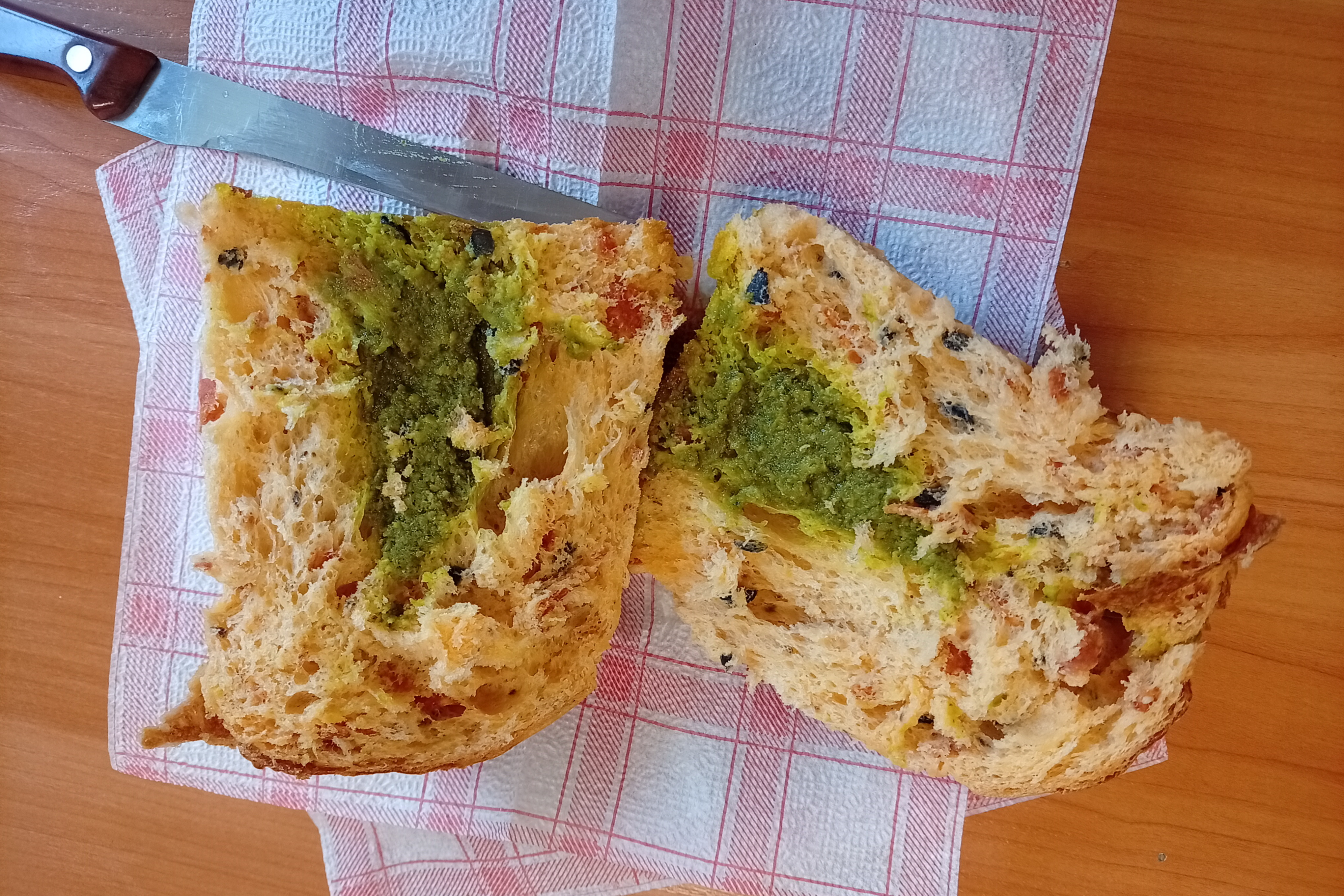 Сочетания для этого праздника не очень привычные, но тесто лёгкое, при этом несухое, пряное с перечным послевкусием. Видимо, за него отвечает колбаса. За яркие впечатления ответственны маслины и соус песто, которого внутри булки достаточно много.