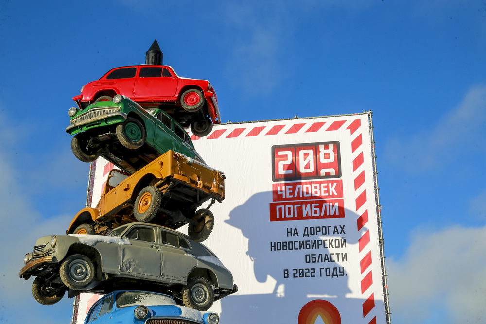 Необычную стелу из машин установили возле музея СССР в Новосибирске