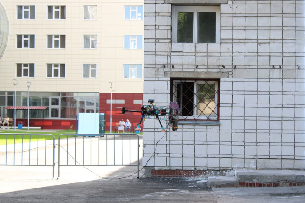 Гексакоптер вздрагивает и начинает медленно подниматься параллельно стене в кампусе НГТУ и распылять на неё краску. Через мониторы за дроном напряжённо наблюдают программисты и робототехники, с лавочек поодаль посматривают любопытные и полиция. Чтобы приступить к работе, организаторы получили разрешение на полёты.