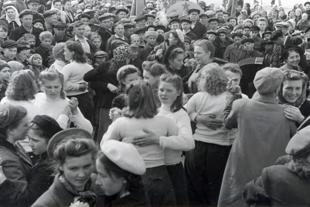 «Вся масса на площади колыхалась. Много было фронтовиков, из госпиталей даже, кто на ногах был, шли, танцевали, какие-то кружки организовывали, по радио играла музыка, и Маланин нам всё играл, слепой Маланин играл на гармошке. Музыка, танцуют, пляшут — вот такое было веселье» (Н. М. Чернова).