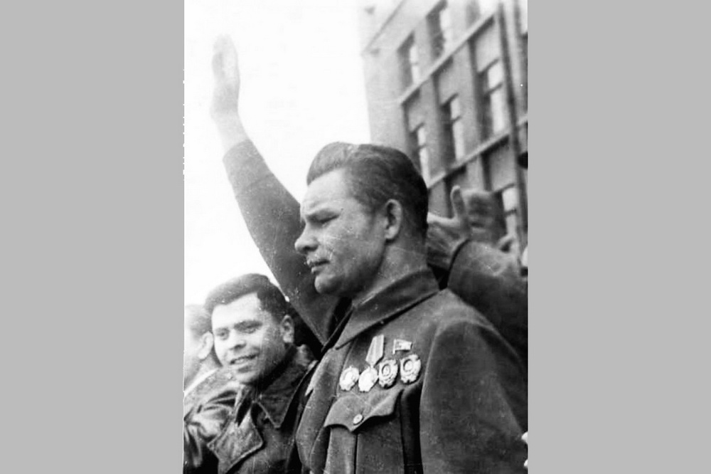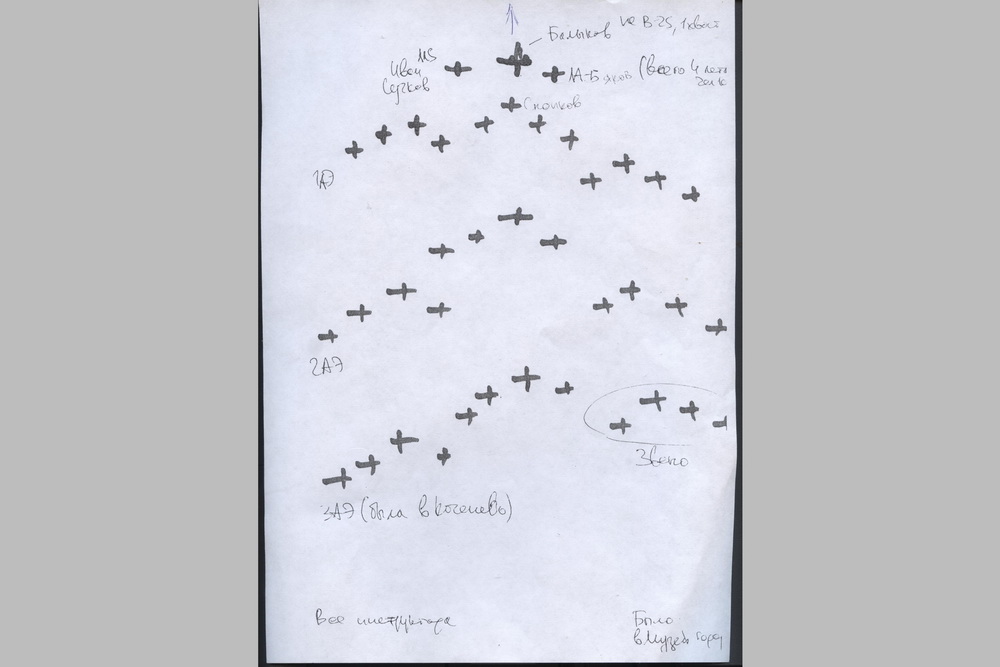 «Проходим над Красным проспектом на высоте 400 метров. Вся площадь заполнена людьми, и дальше по проспекту люди, люди, люди... Главной задачей было держать расстояние, но, конечно, помню лица, обращённые к нам...» (Я. Ф. Осадчий)