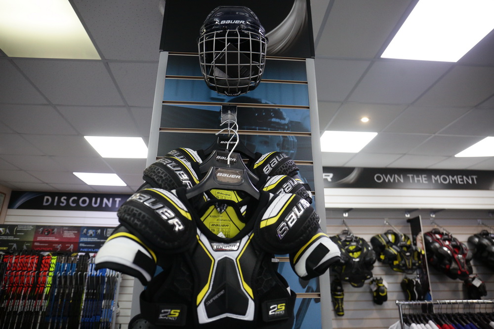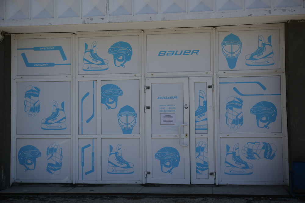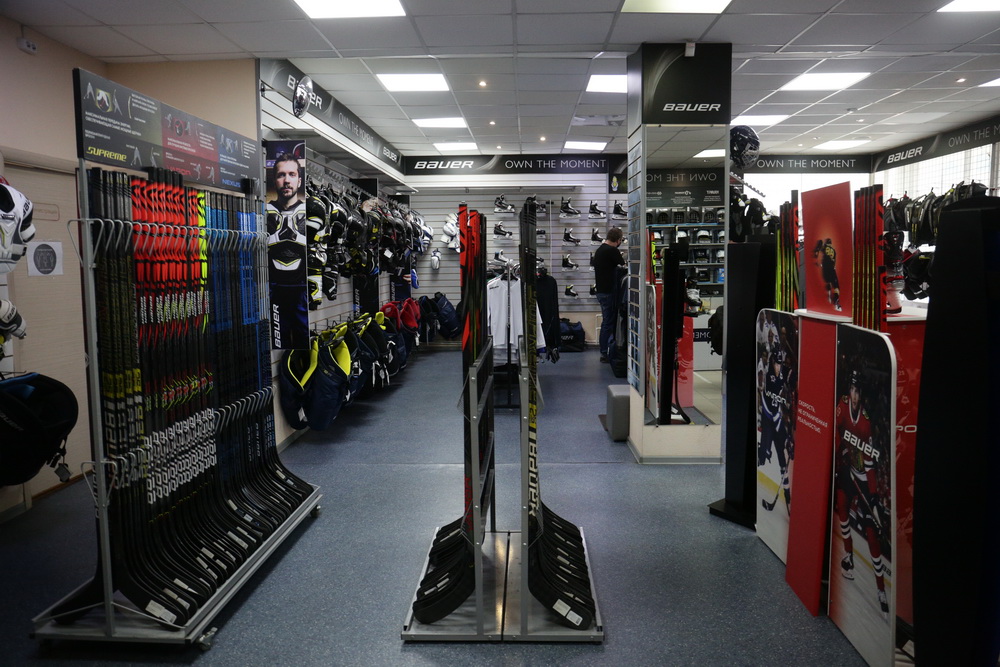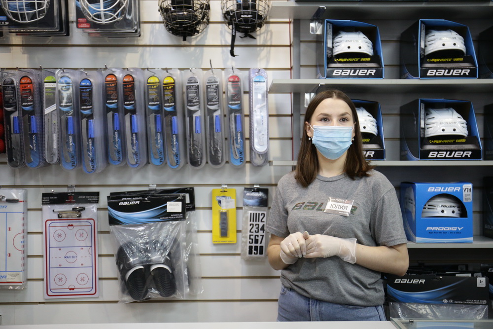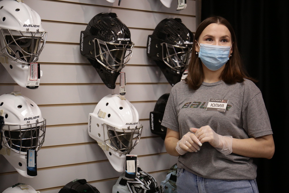 Хоккейная экипировка — товар штучный. Не каждый день нужен шлем стоимостью несколько десятков тысяч. В обычный день спортивный магазин обслуживает около 30 человек. Небольшая площадь и отдельный вход — это те условия, на которых магазин может работать на законных основаниях с этой недели.