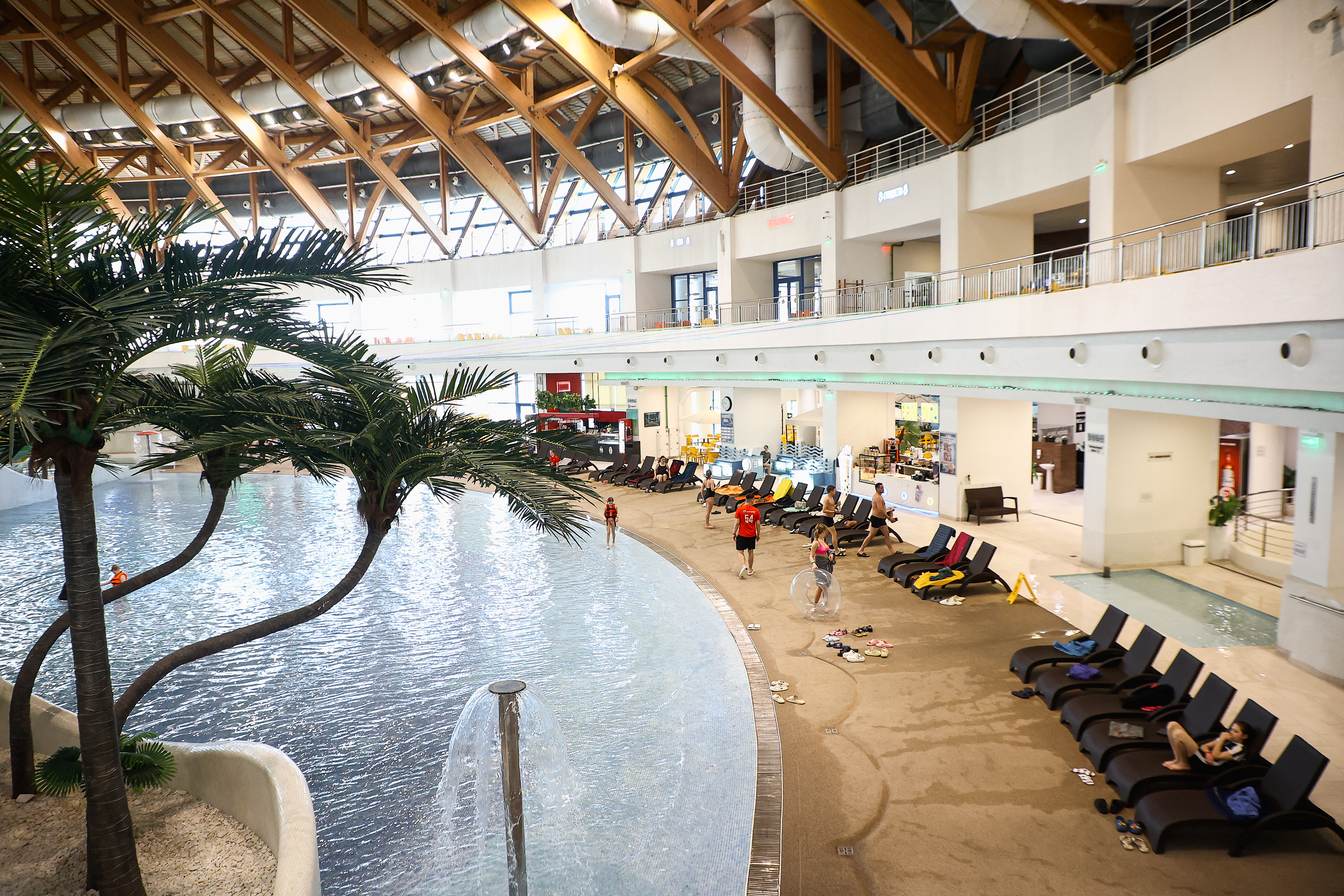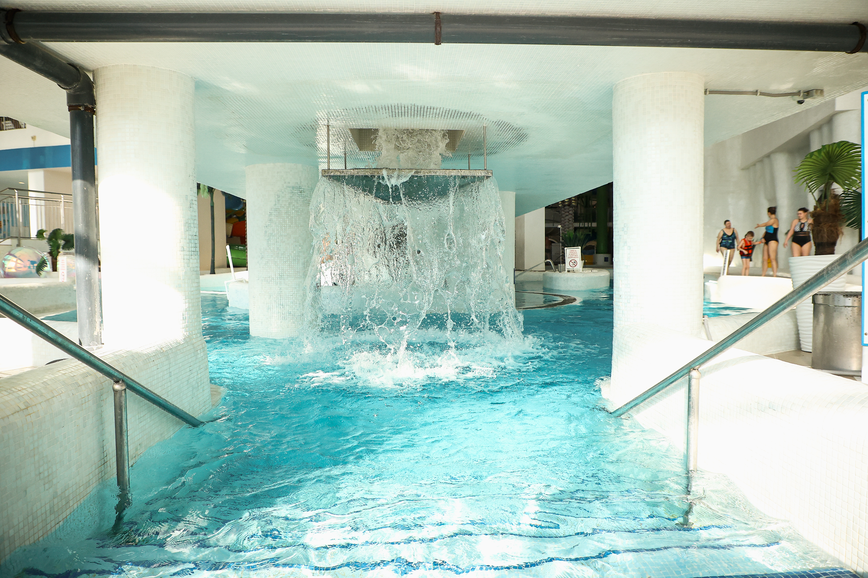 Наконец-то мы добрались до главного — зоны развлечений. Первое, что вы увидите, — огромный голубой бассейн. Раз в полчаса там поднимается «морская» волна. Если заплыть дальше, дно будет уходить глубже.