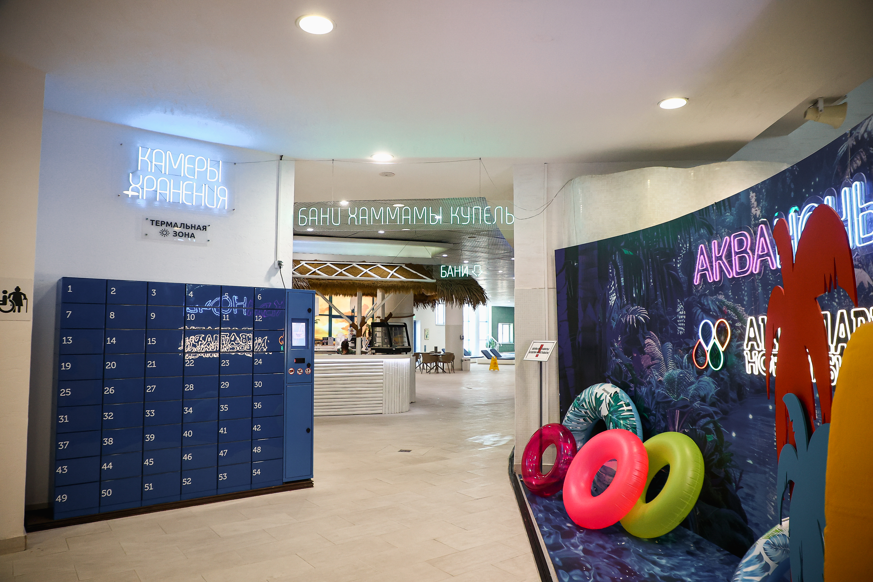 Личные вещи остаются в кабинке, которая закрепляется за вами. Забыли номер шкафчика — не страшно. В раздевалке смонтировано специальное устройство, которое не только выдаст номер кабинки, но и покажет, сколько времени вы находитесь в аквапарке и какую сумму успели накрутить. Достаточно приложить браслет к корпусу.