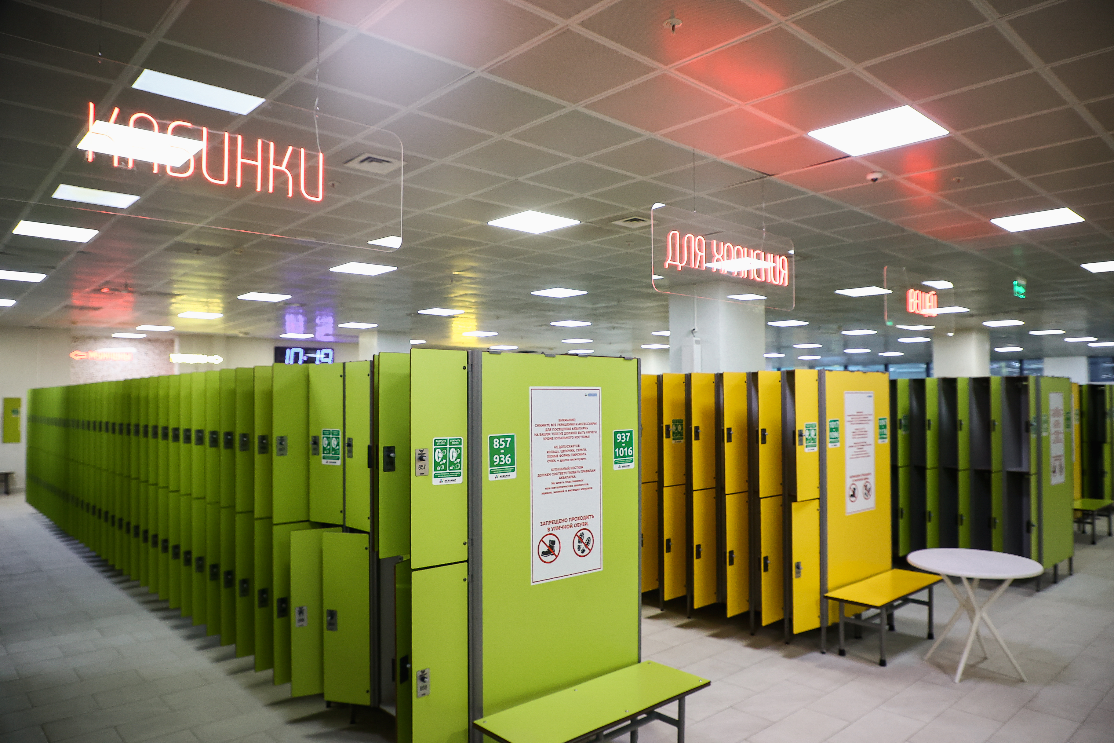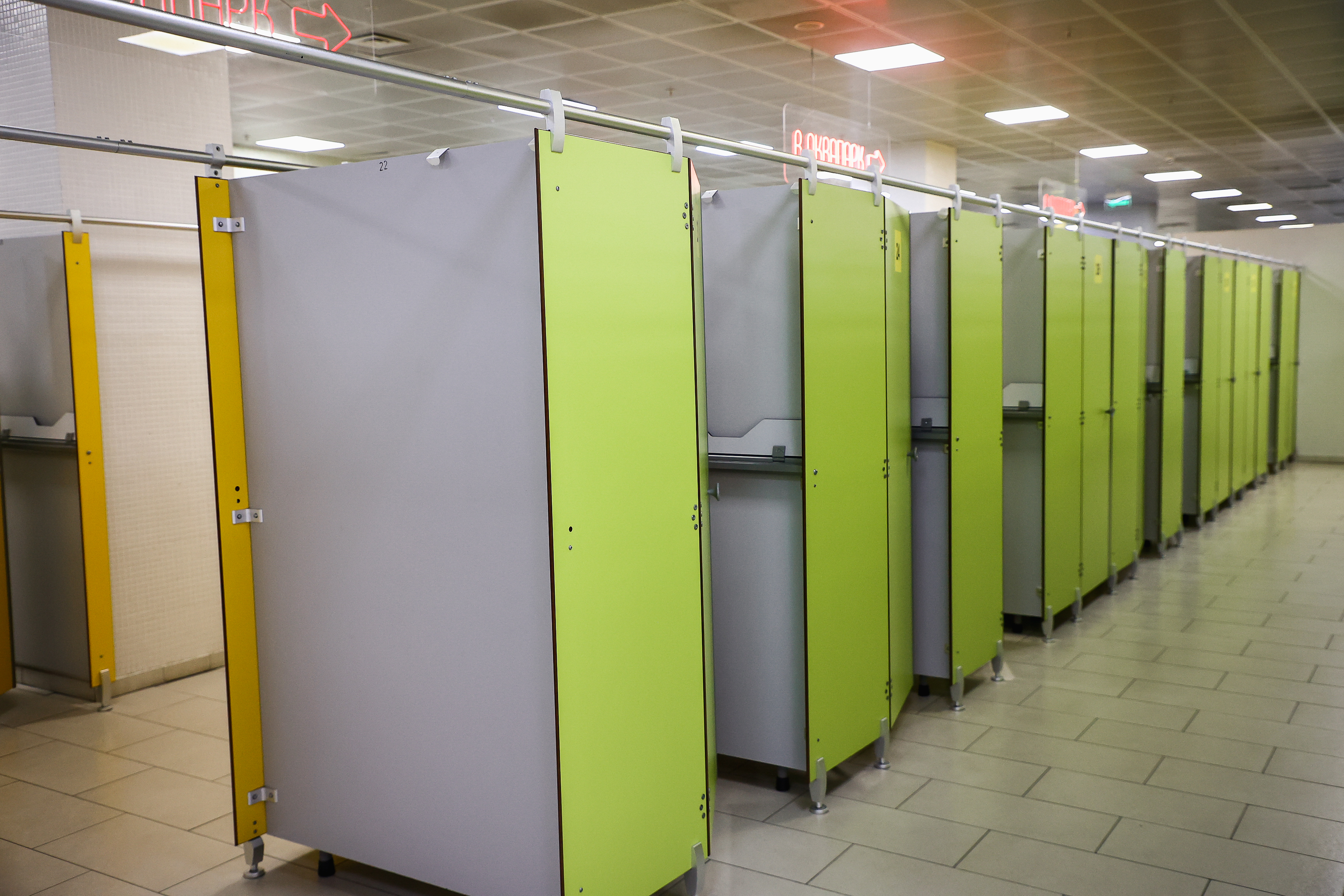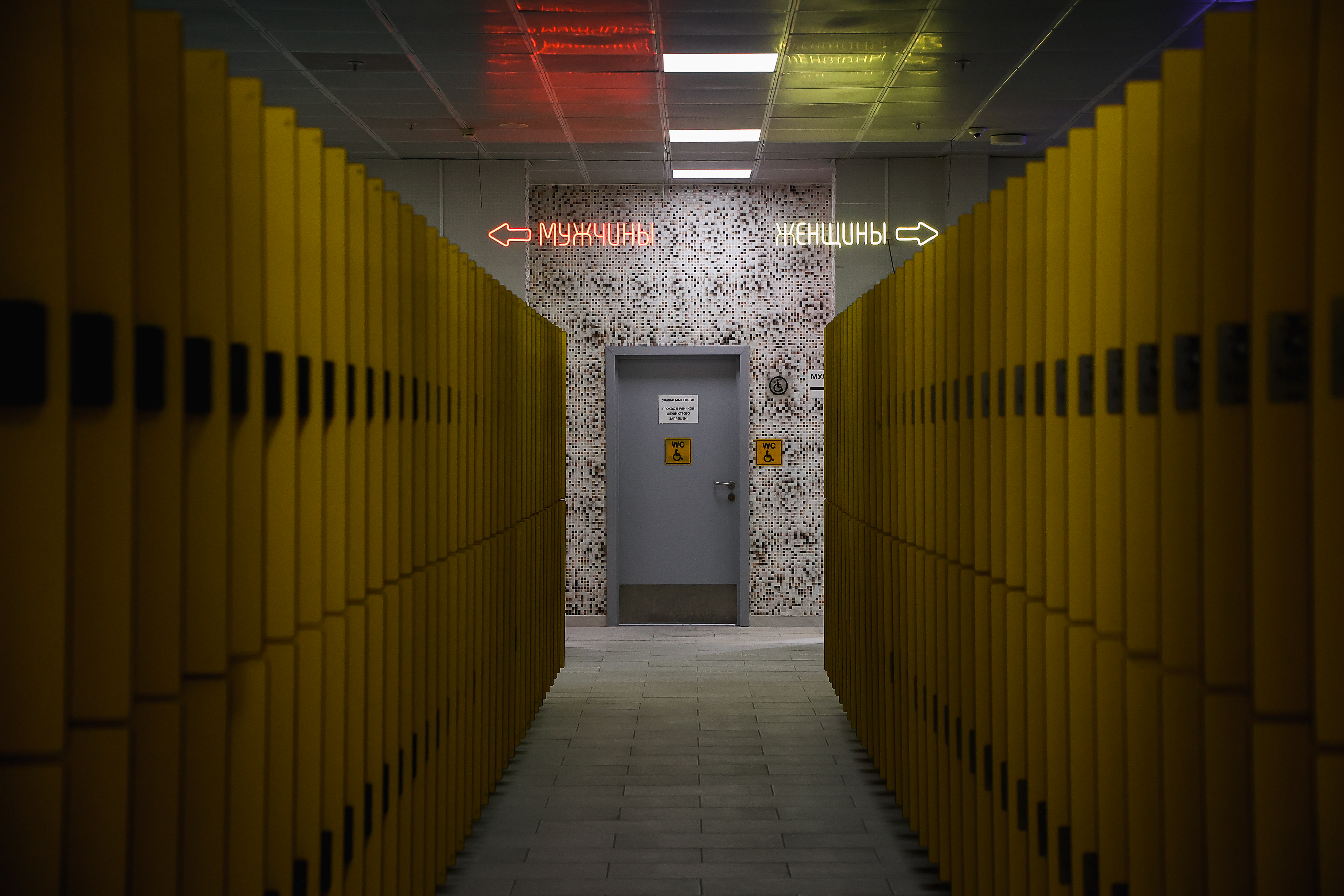 Оказавшись внутри, вы увидите длинные ряды жёлтых и зелёных кабинок. Переодевание проходит в два этапа: в жёлтой зоне вы снимаете верхнюю одежду и обувь, а в зелёной уже надеваете купальник или плавки.