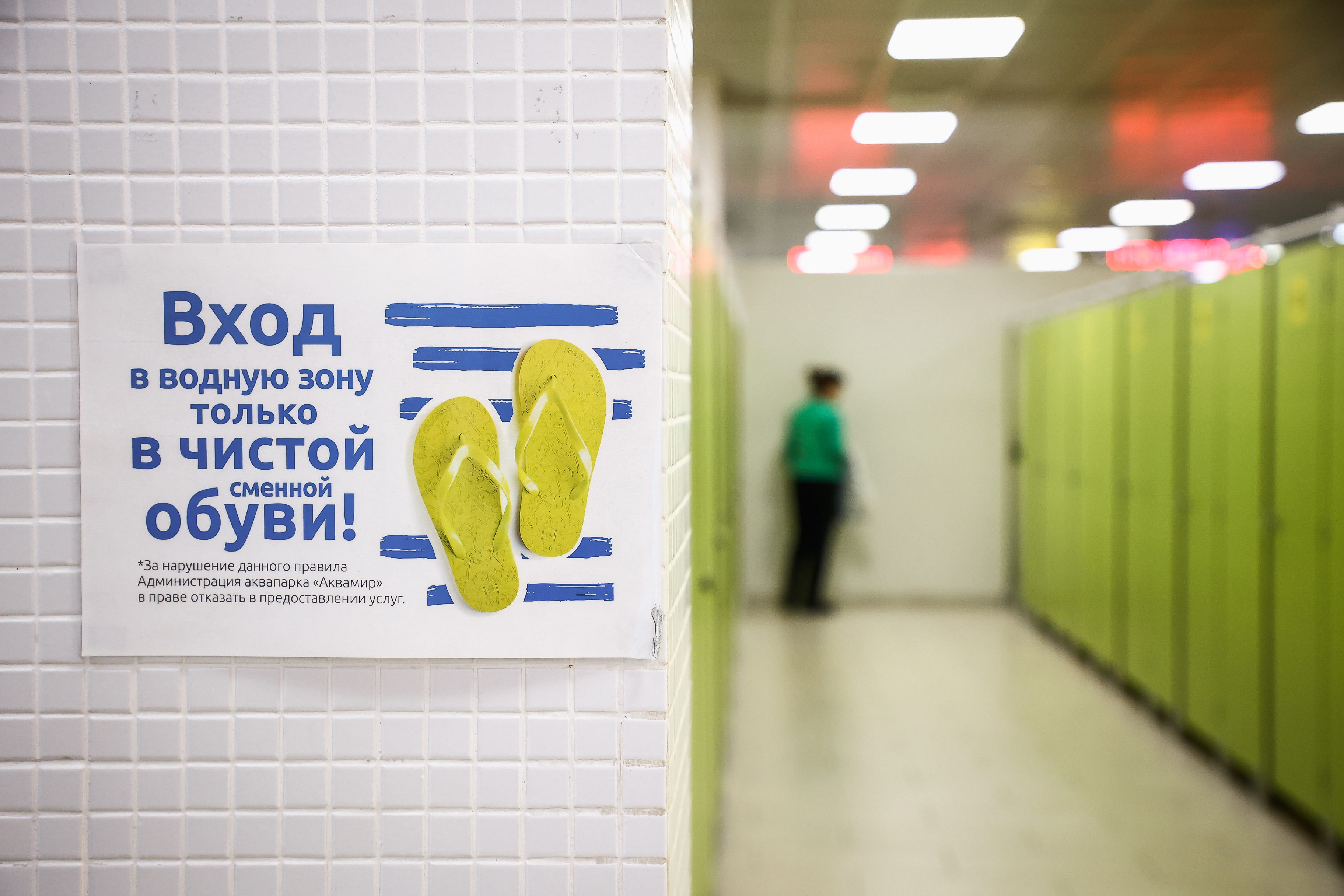 Чтобы попасть в раздевалку, нужно спуститься вниз по спиральной лестнице. К этому моменту у вас уже должен быть с собой весь необходимый набор: купальник (здесь есть важный нюанс), сланцы, полотенце, гигиенические средства (мыло, шампунь, мочалка), а также пакет для уличной обуви — отдельной полочки для неё нет.