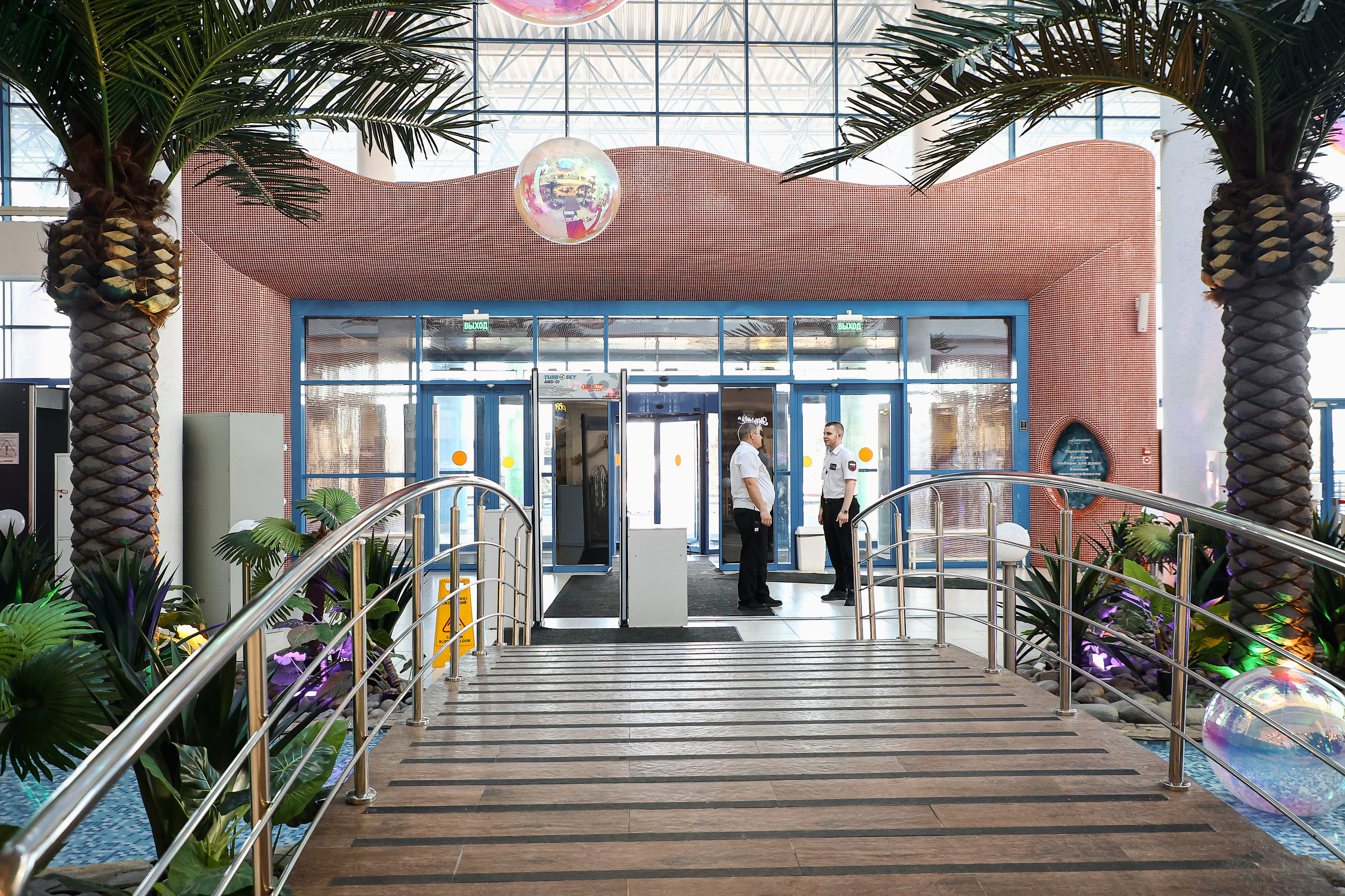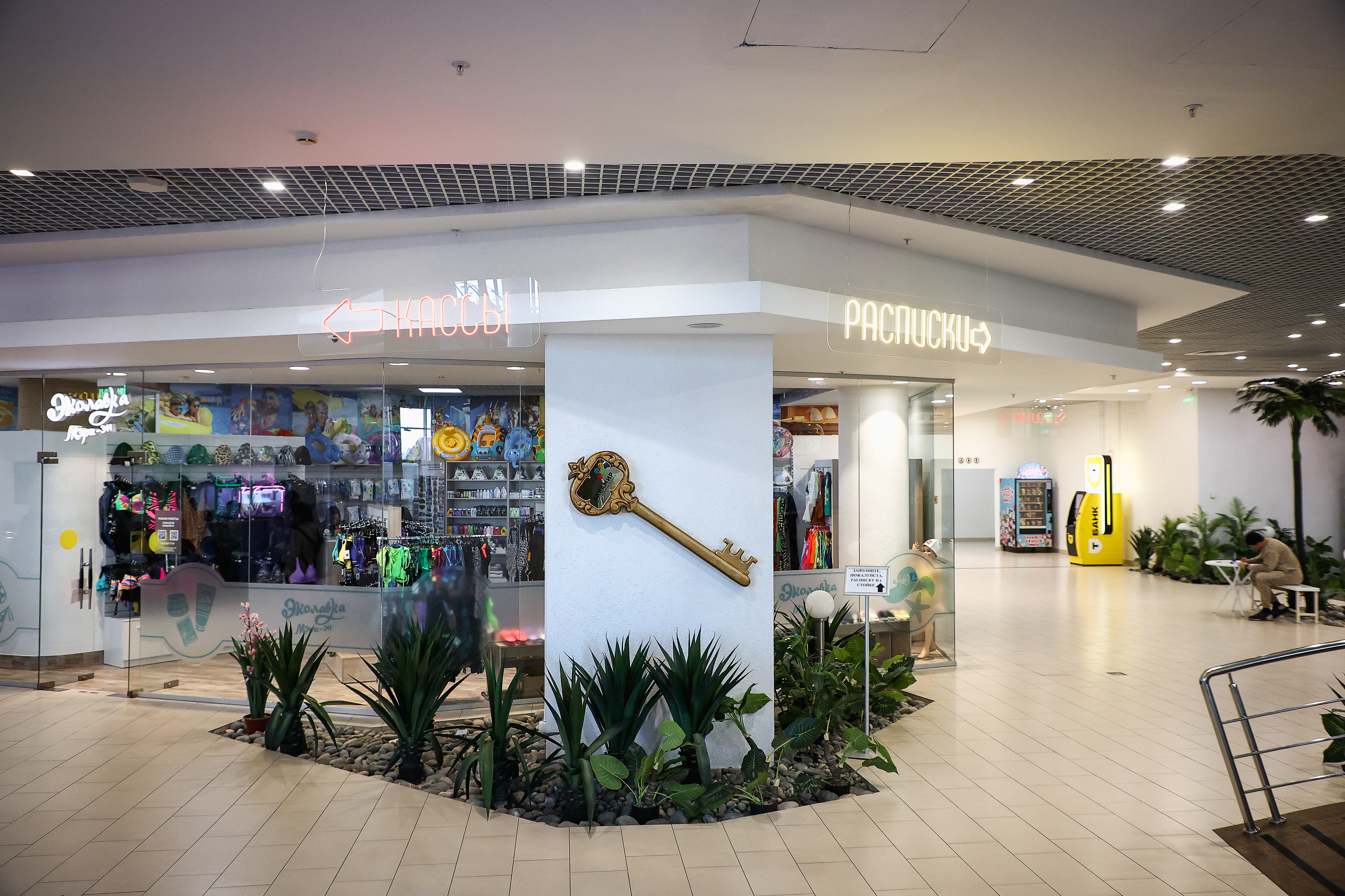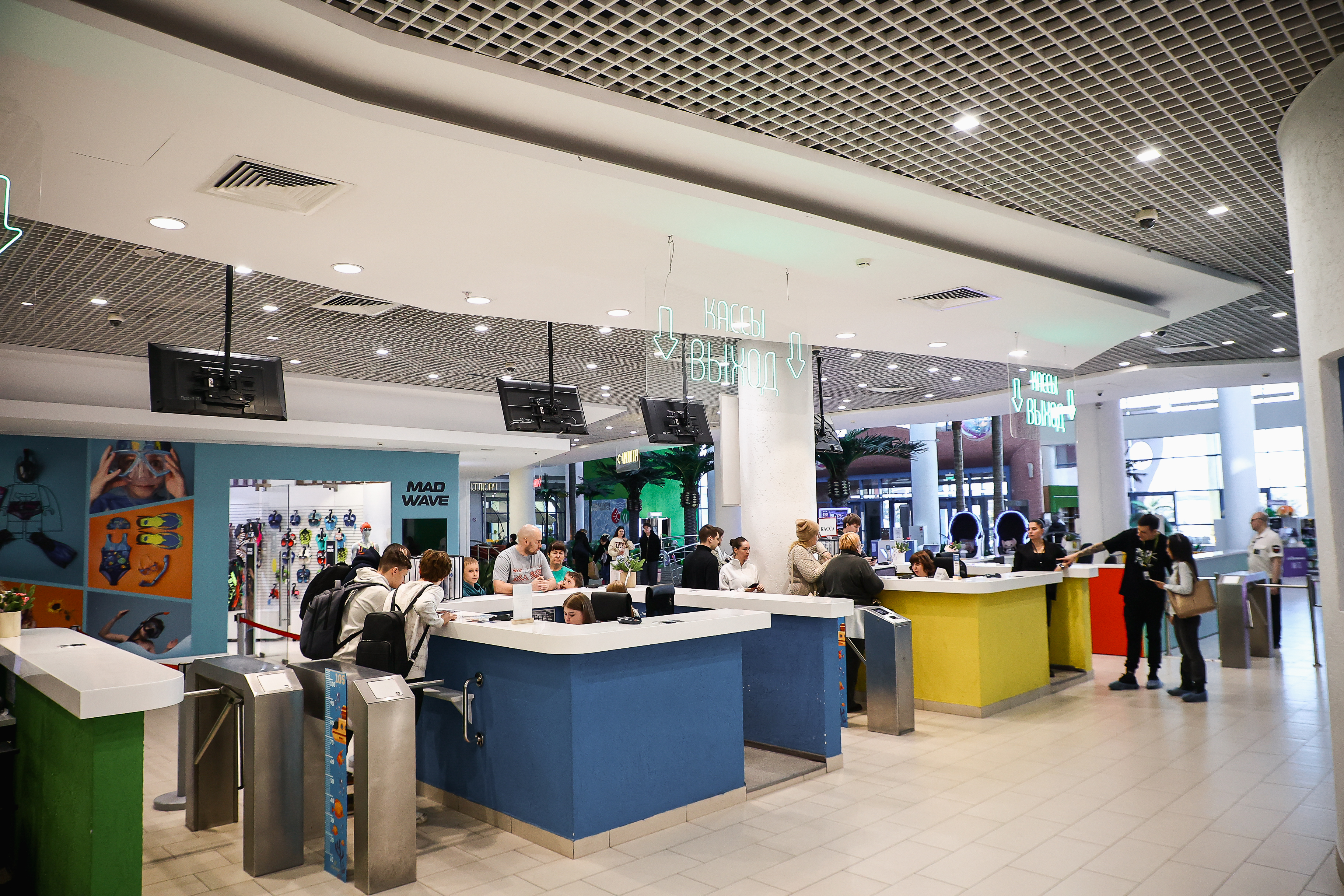 В фойе можно осмотреться: здесь есть кофейня, несколько фотозон и лавки с пляжными принадлежностями и сувенирами. Для маломобильных посетителей предусмотрены коляски и специальный лифт.