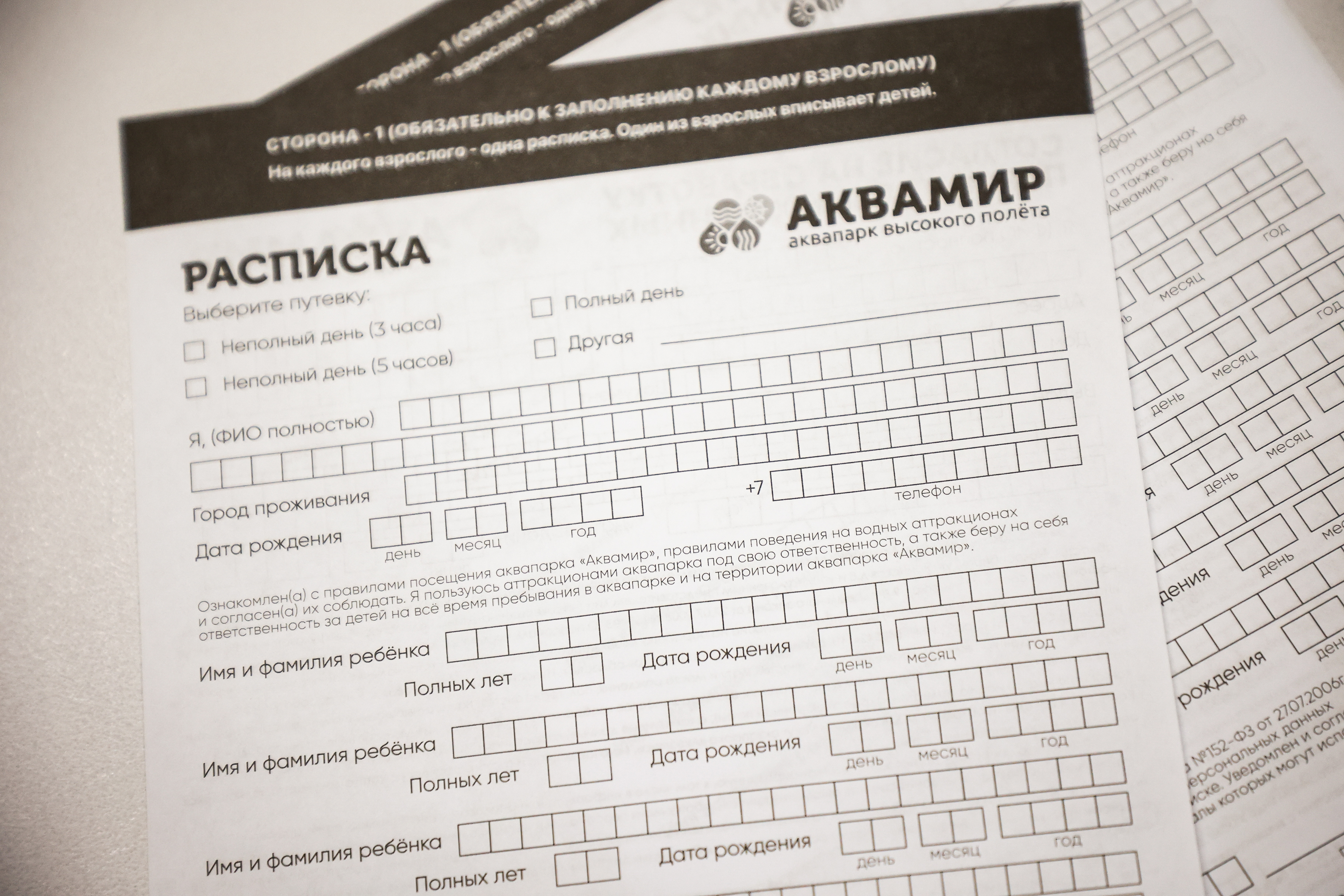 Дальше направляемся в сторону гардероба, сдаём верхнюю одежду и идём заполнять расписку о том, что вы ознакомлены с правилами безопасности аквапарка. Один взрослый — одна расписка. Имя ребёнка вписывают под фамилией родителя или сопровождающего.