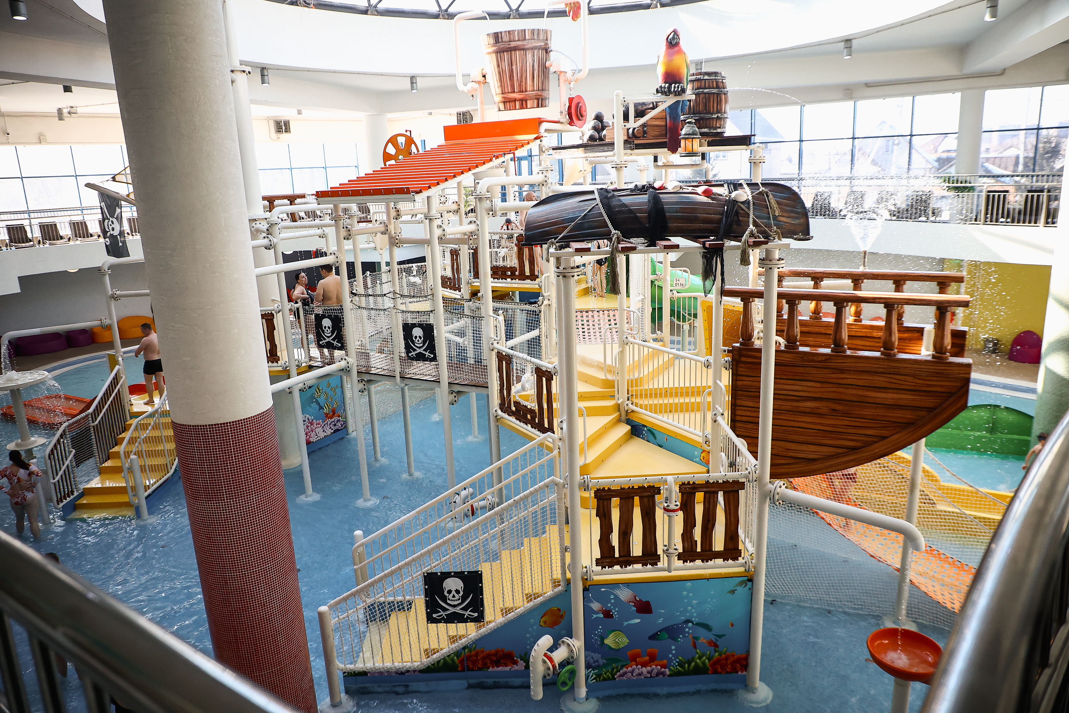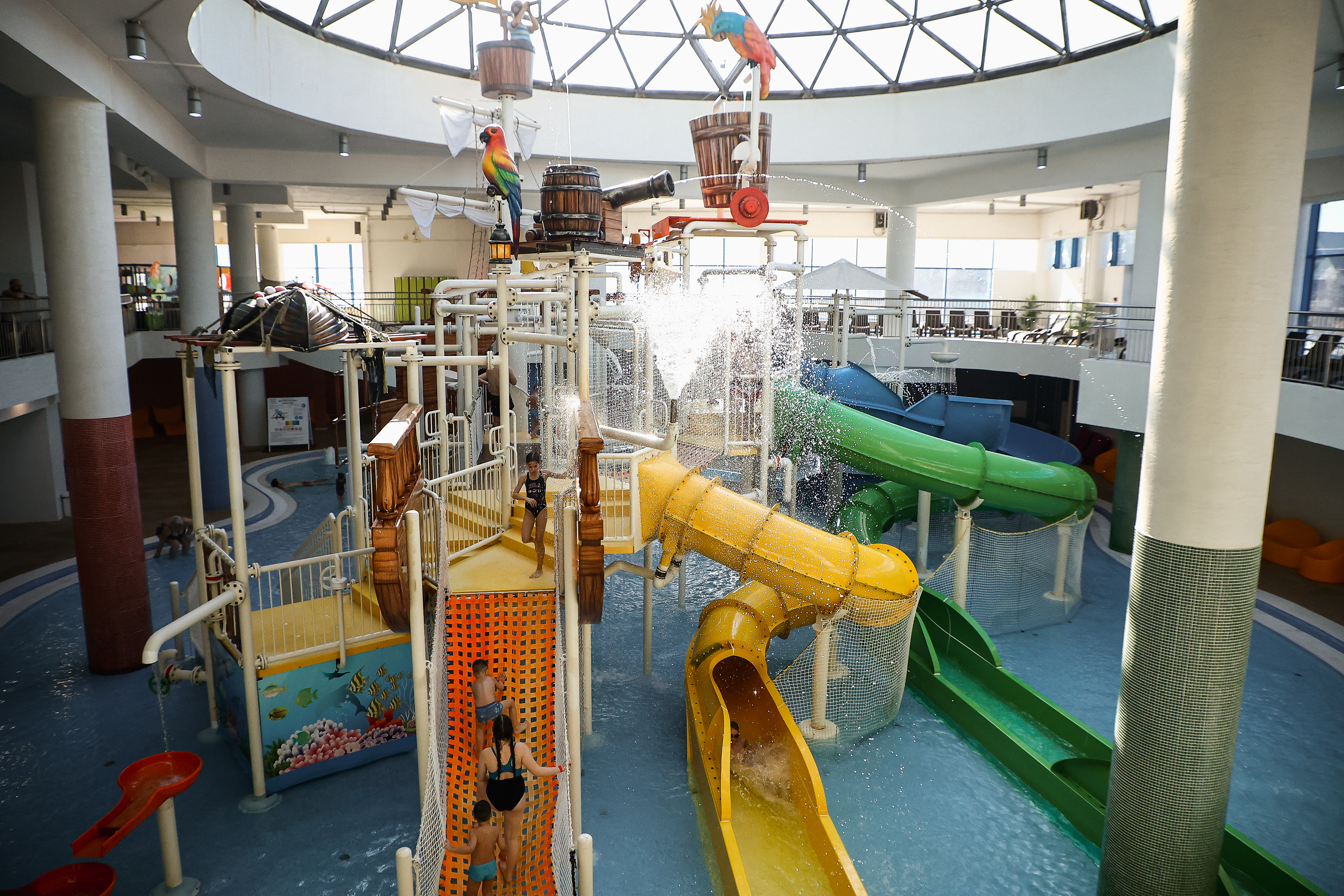 Для детей работает игровая зона «Акваплей», стилизованная под большой пиратский корабль с небольшими безопасными спусками. Малышам здесь будет чем себя занять.