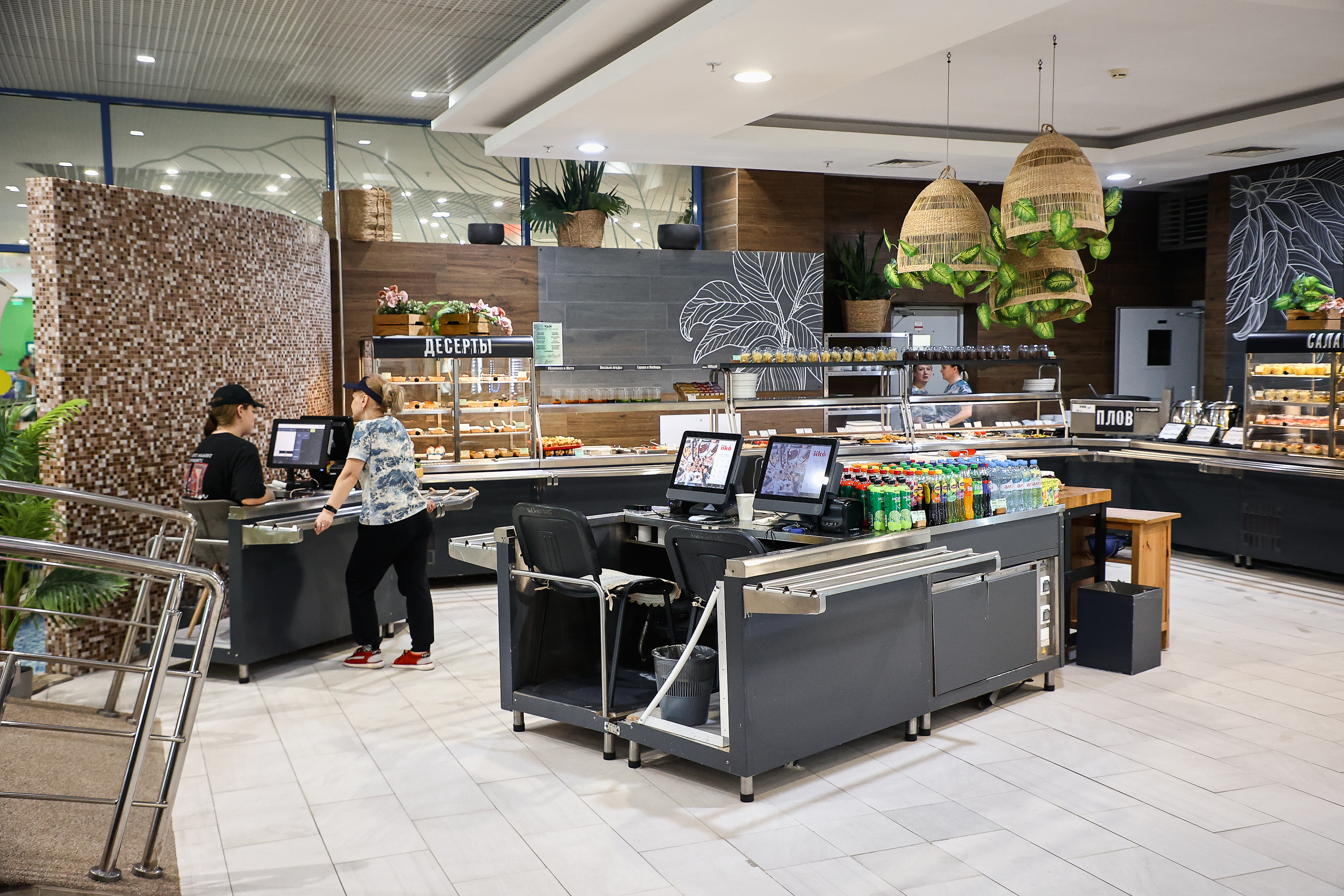 Рядом расположился «Тропический бар», где можно выпить коктейль или кофе. Неподалёку работает кафе с домашней кухней. Есть и отдельная детская зона питания — с пиццей, картофелем фри и мороженым.