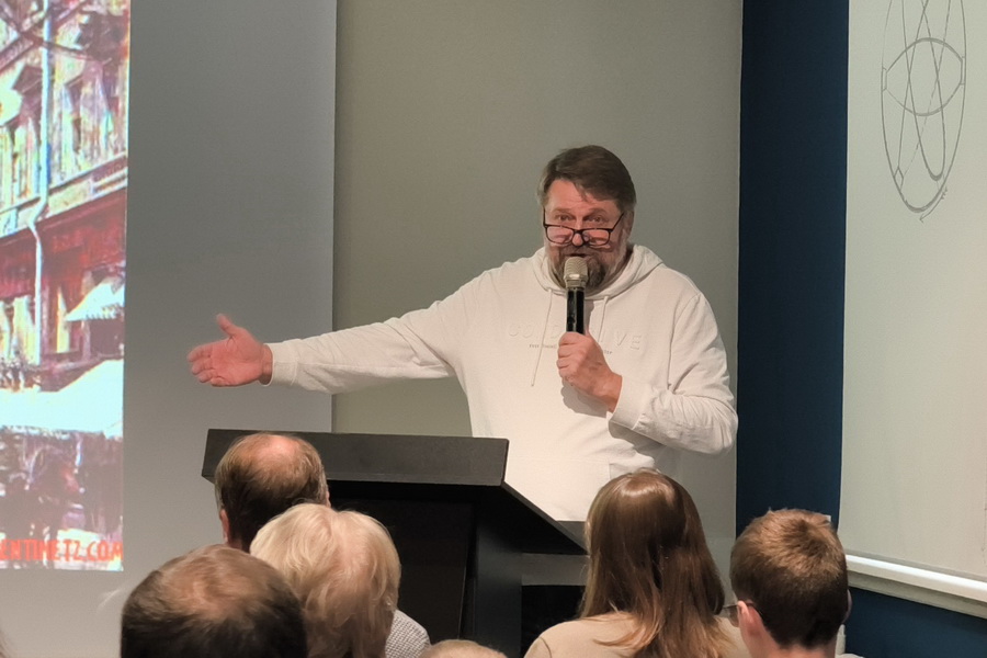 После того как работы отправились на проверку к филологам (а в состав жюри вошли учителя русского языка и литературы высшей категории, заслуженные учителя и лауреаты профессиональных конкурсов), научный сотрудник Музея Новосибирска Константин Голодяев подробно разобрал текст диктанта, рассказав в форме популярной мини-лекции о том, в каких местах города происходили описываемые события и в каком историческом контексте взаимодействуют герои романа.