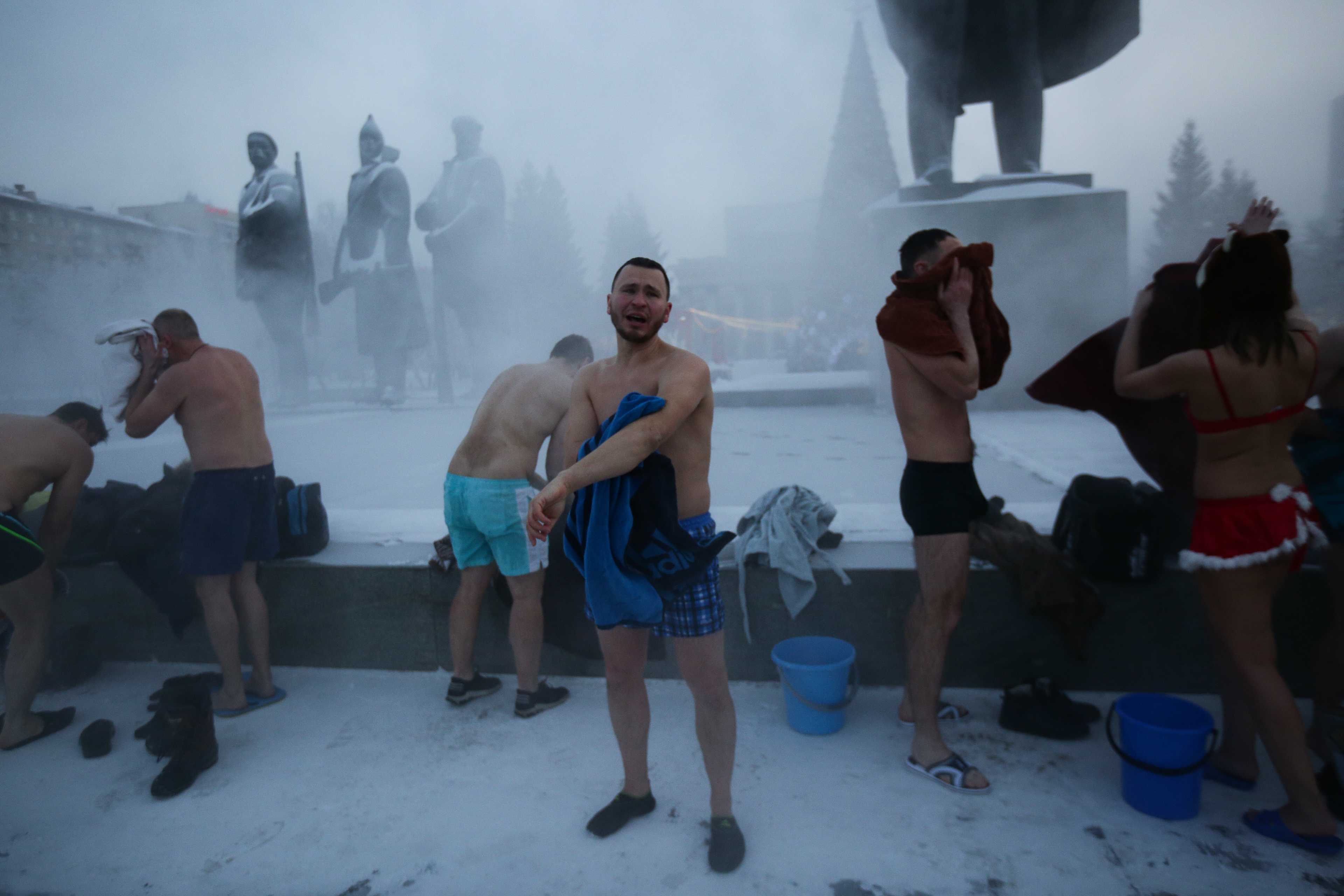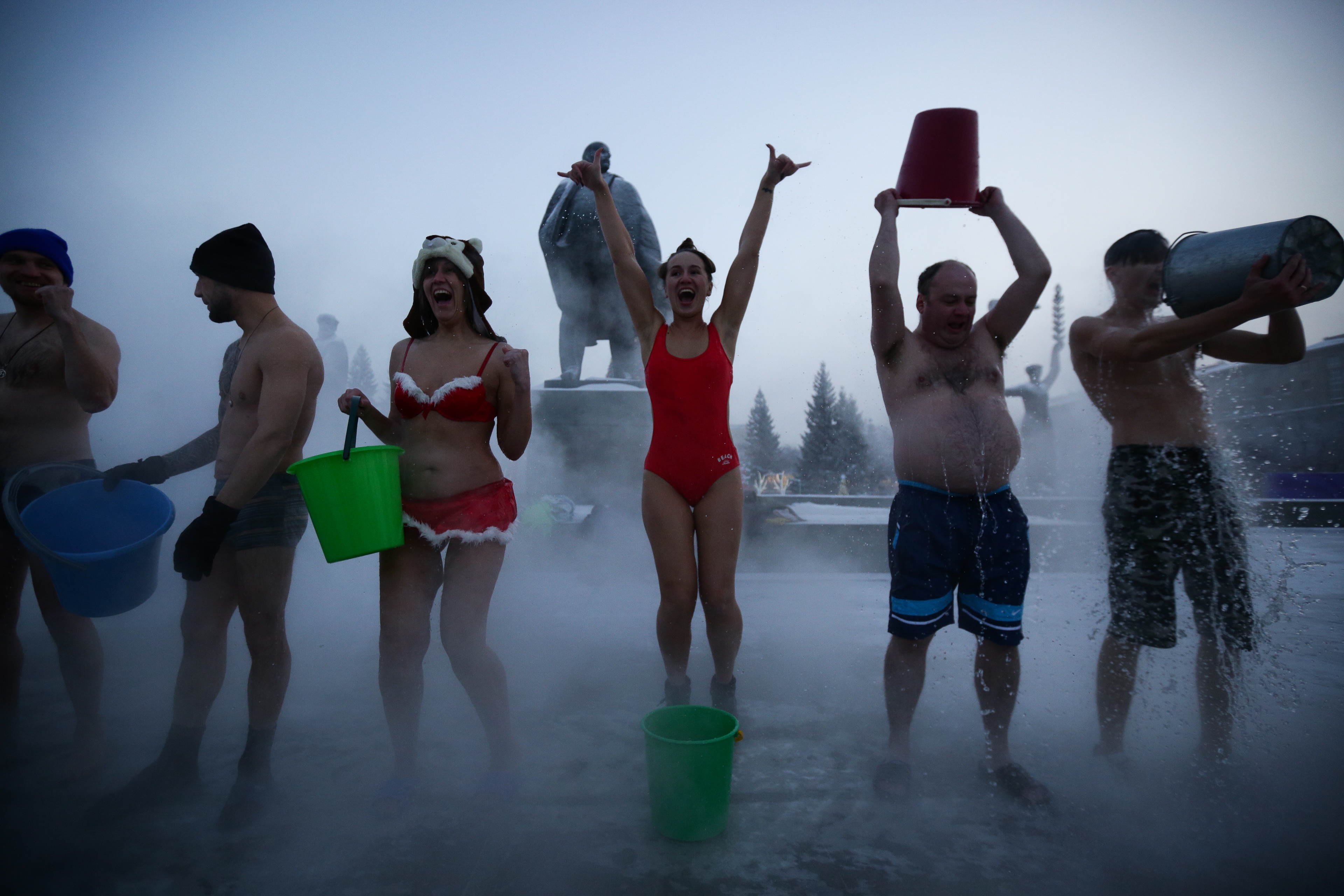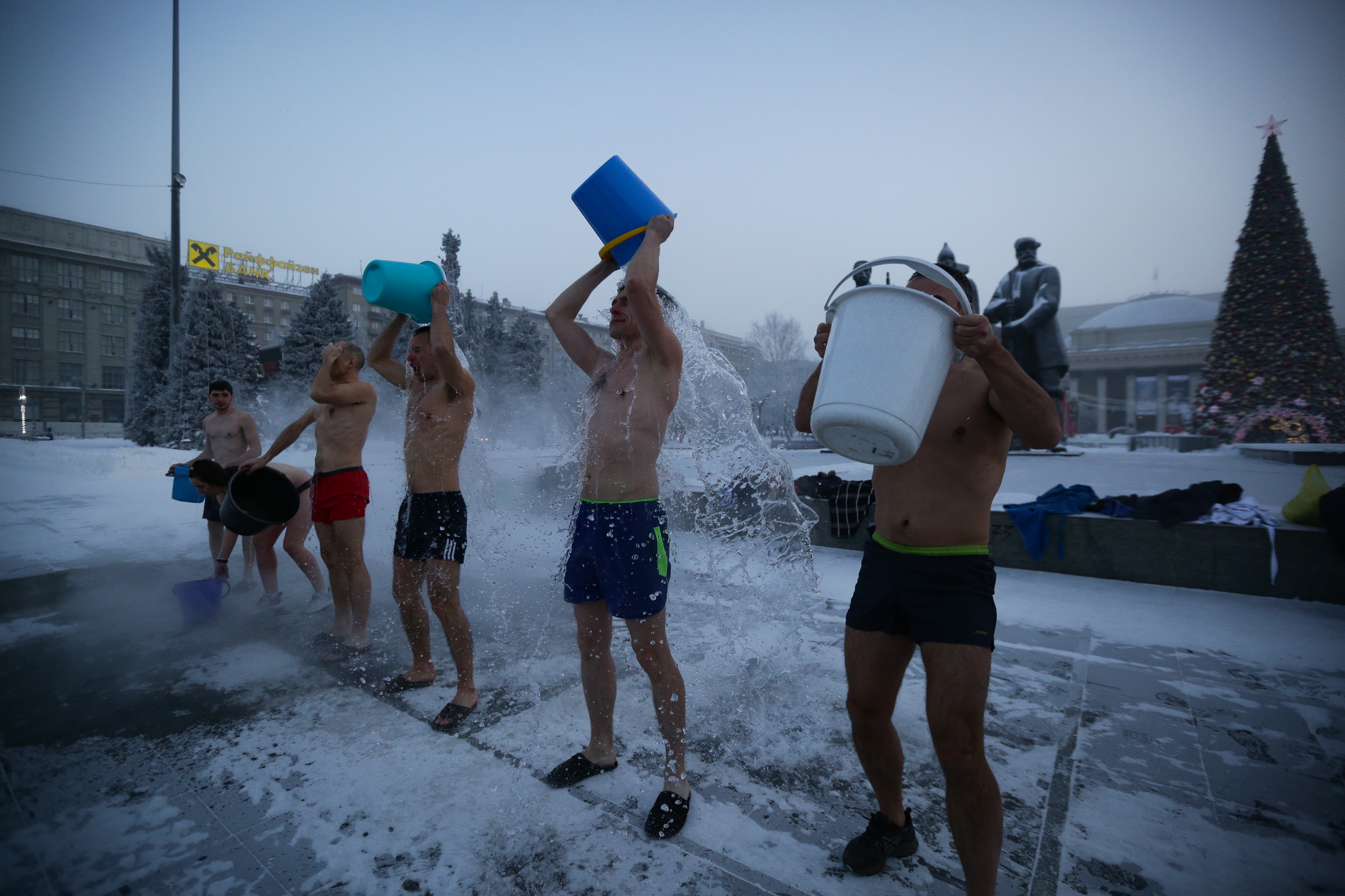 Сибиряки облились холодной водой на площади Ленина утром 27 декабря. В акции приняли участие два десятка храбрецов. Зрителей было немного. Мало кто рискнул даже выйти на улицу в такую погоду. Термометр на здании мэрии в это время показывал −33.