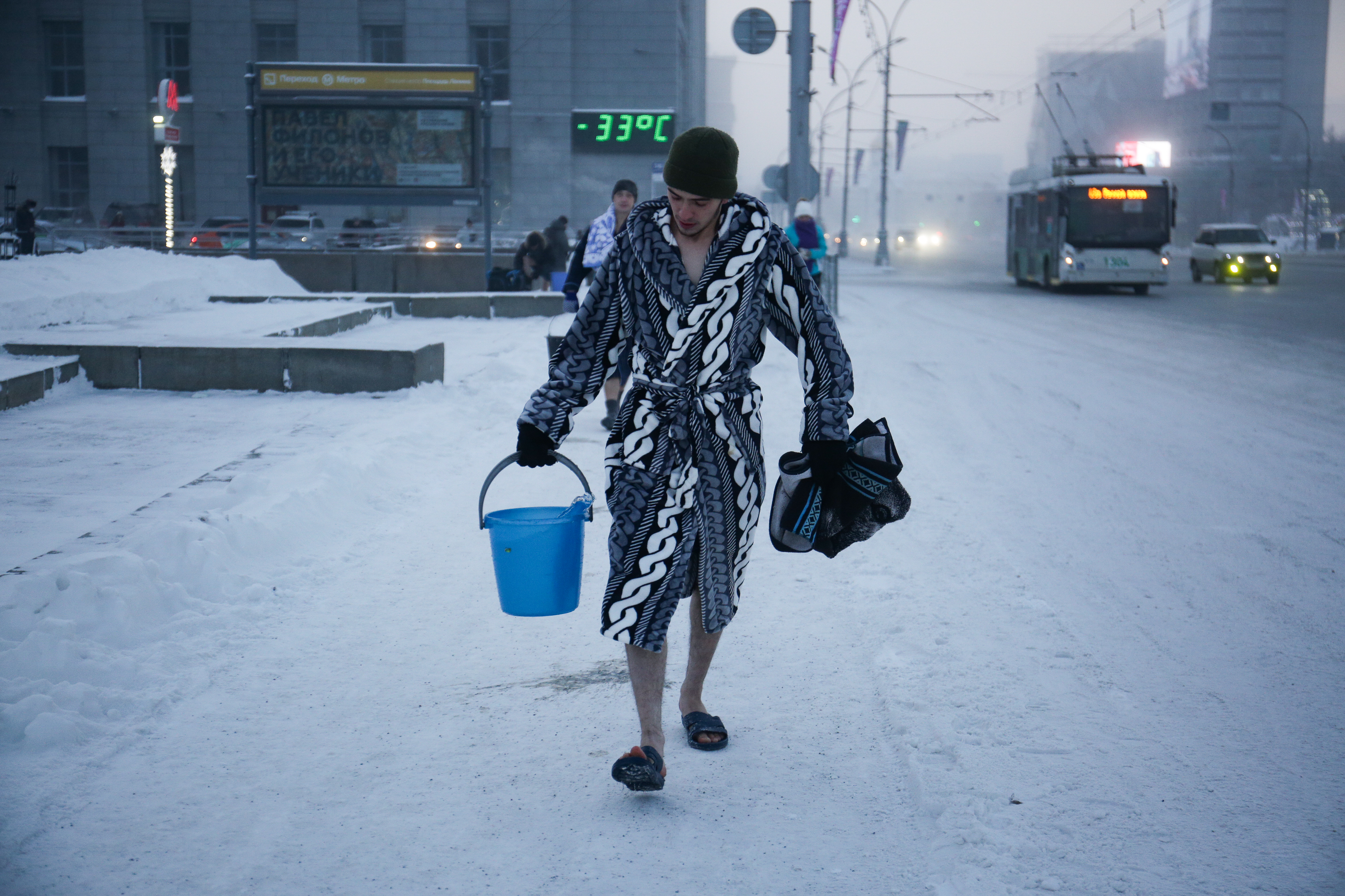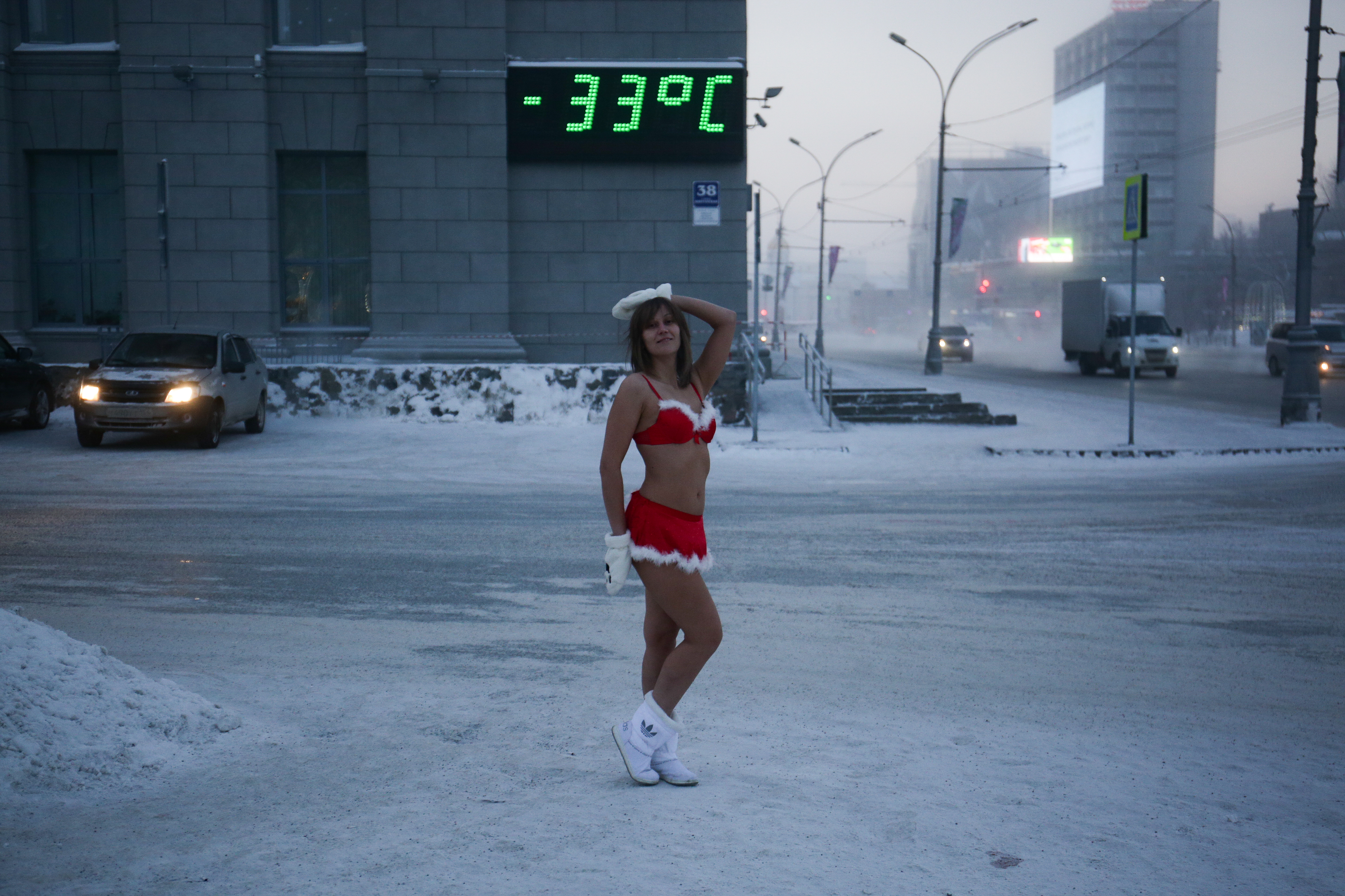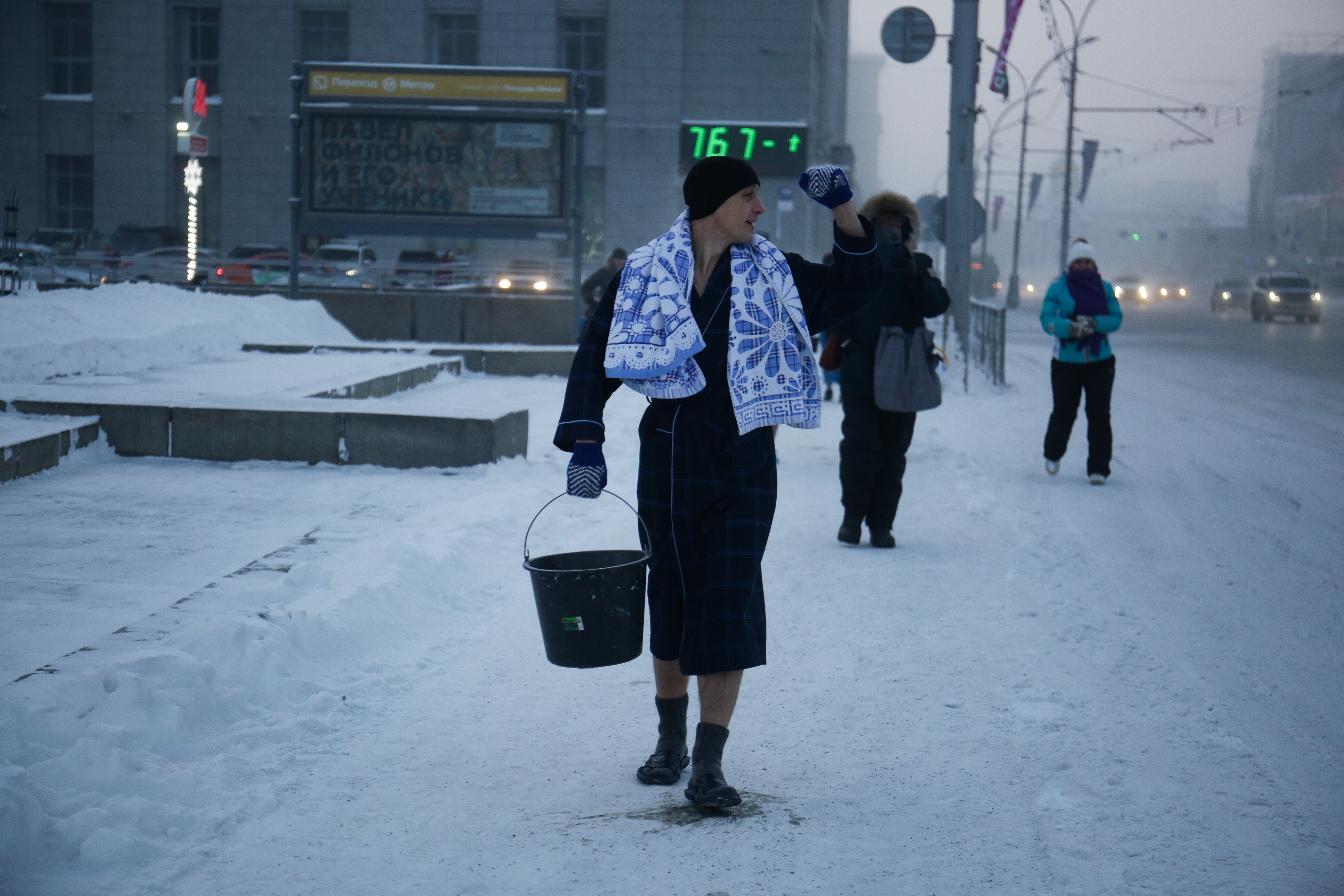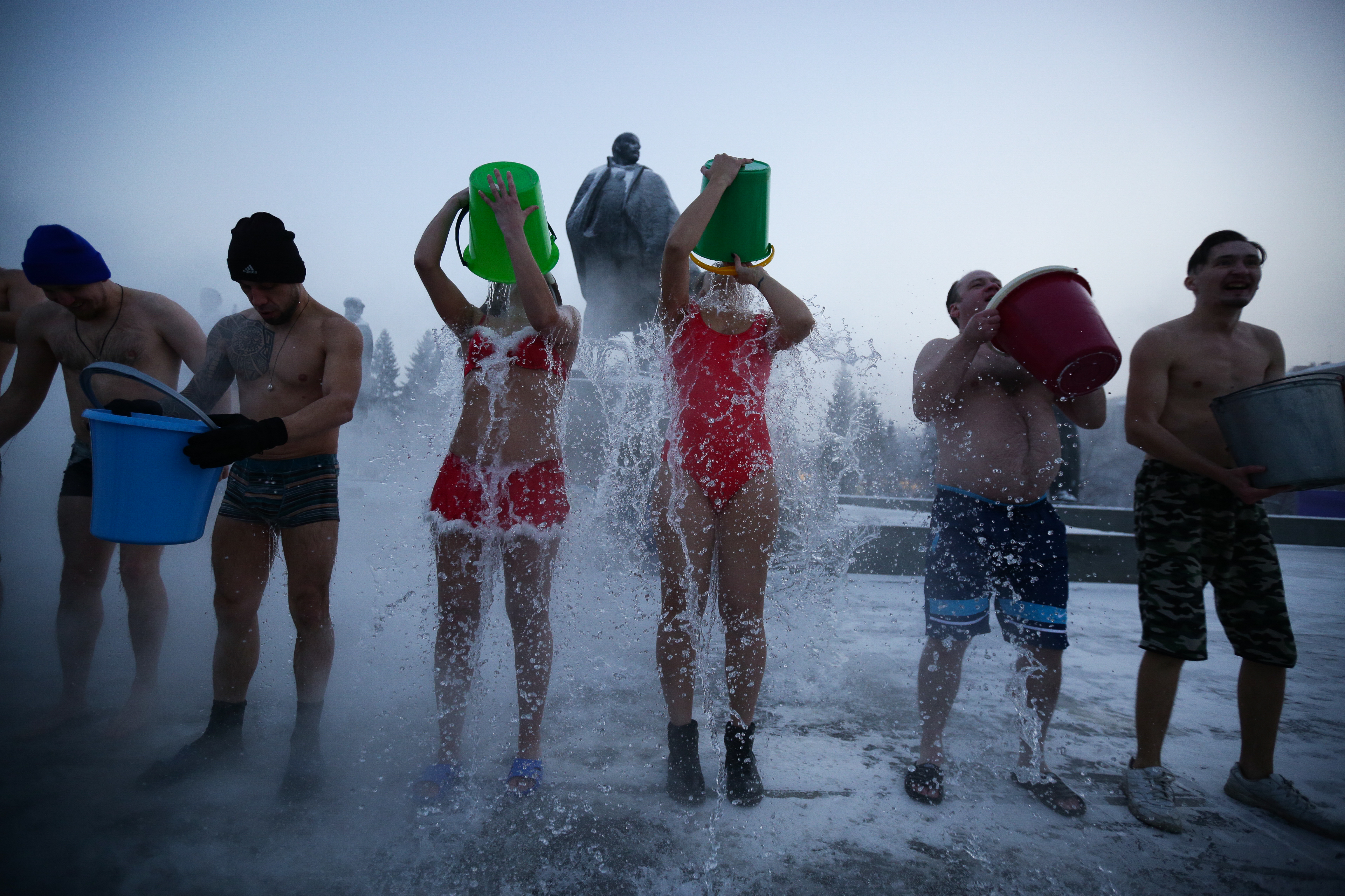 Сибиряки облились холодной водой на площади Ленина утром 27 декабря. В акции приняли участие два десятка храбрецов. Зрителей было немного. Мало кто рискнул даже выйти на улицу в такую погоду. Термометр на здании мэрии в это время показывал −33.