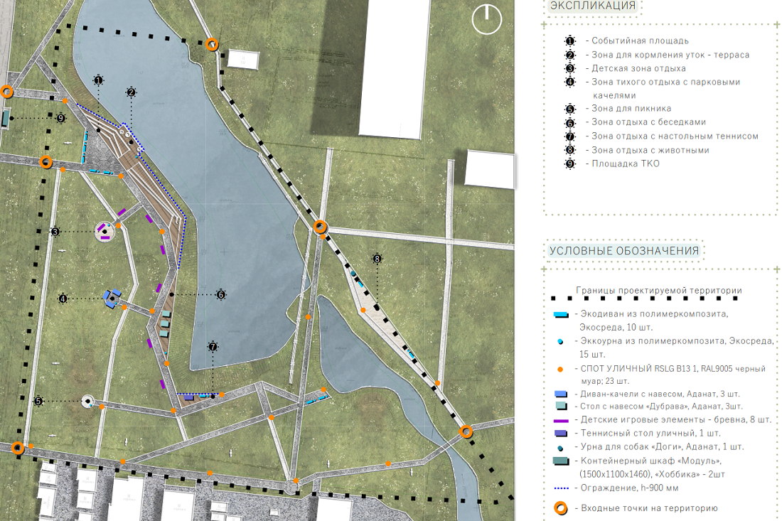 Планируют установить десять экодиванов из полимеркомпозита, три дивана-качели с навесом, три стола с навесом «Дубрава», брёвна для сидения и игр, теннисный стол, системы освещения и видеонаблюдения, контейнеры для мусора, а также урну для собак «Доги».