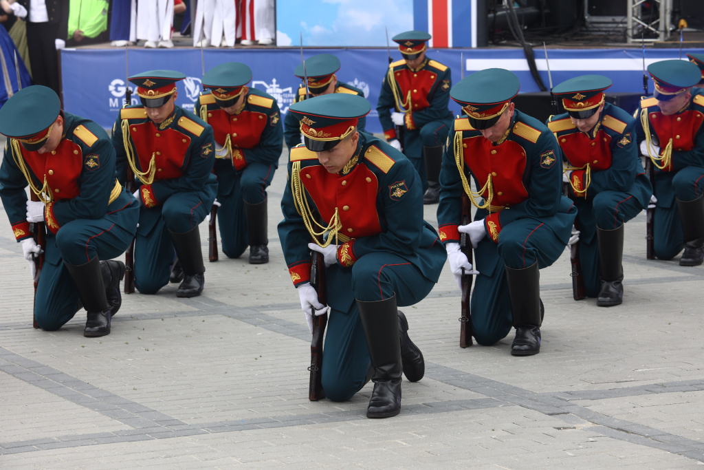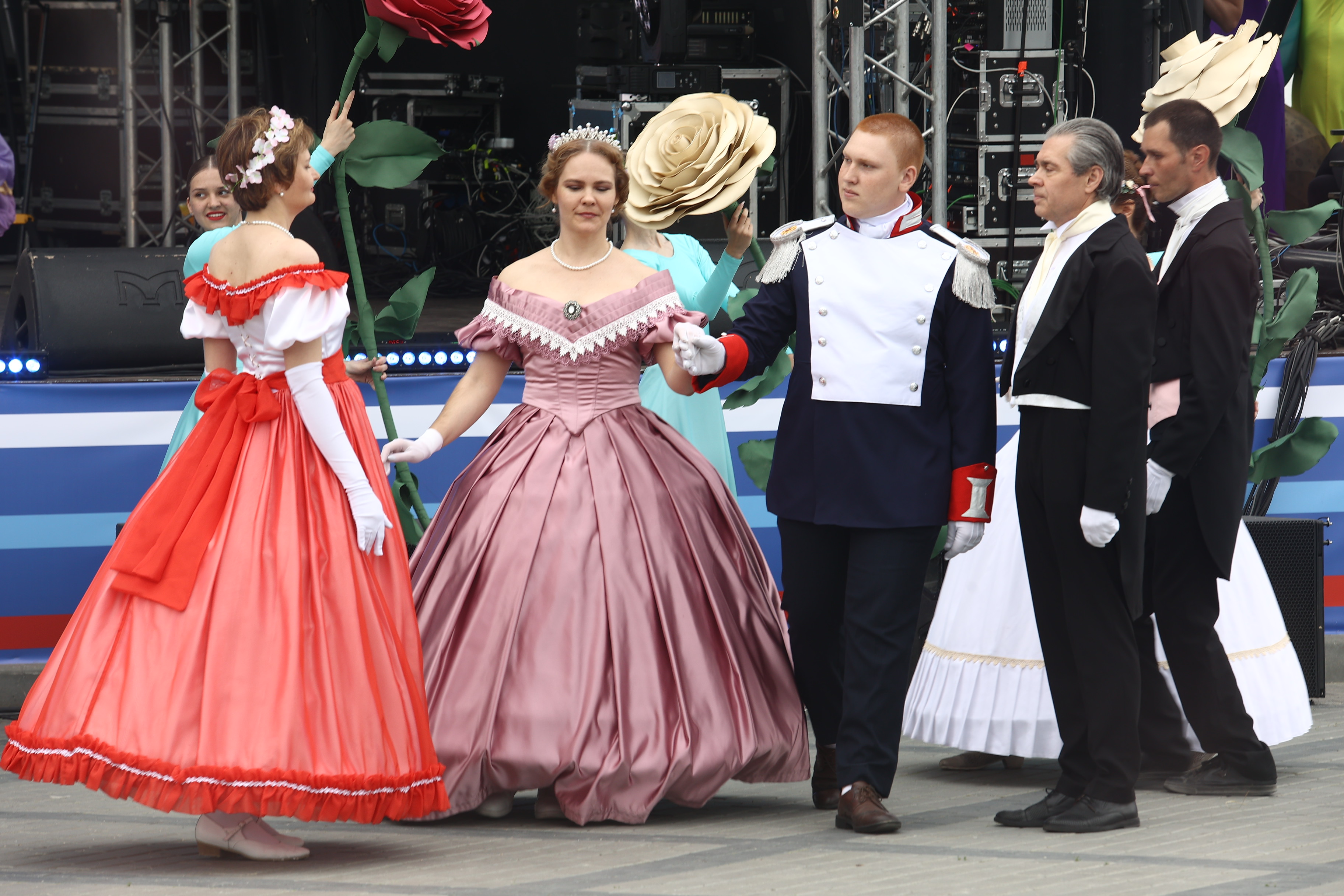 Духовой оркестр играет государственный гимн, гости праздника, размахивая триколорами, подхватывают главный мотив страны. На сцену поднимаются первые лица области и города.