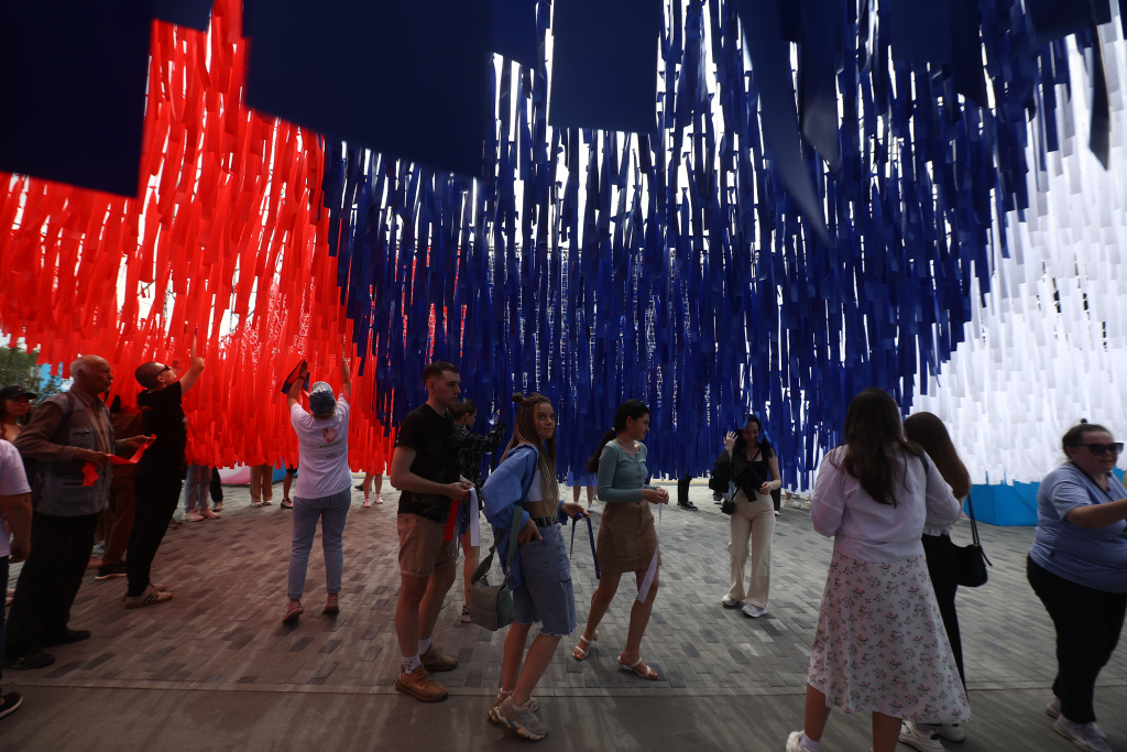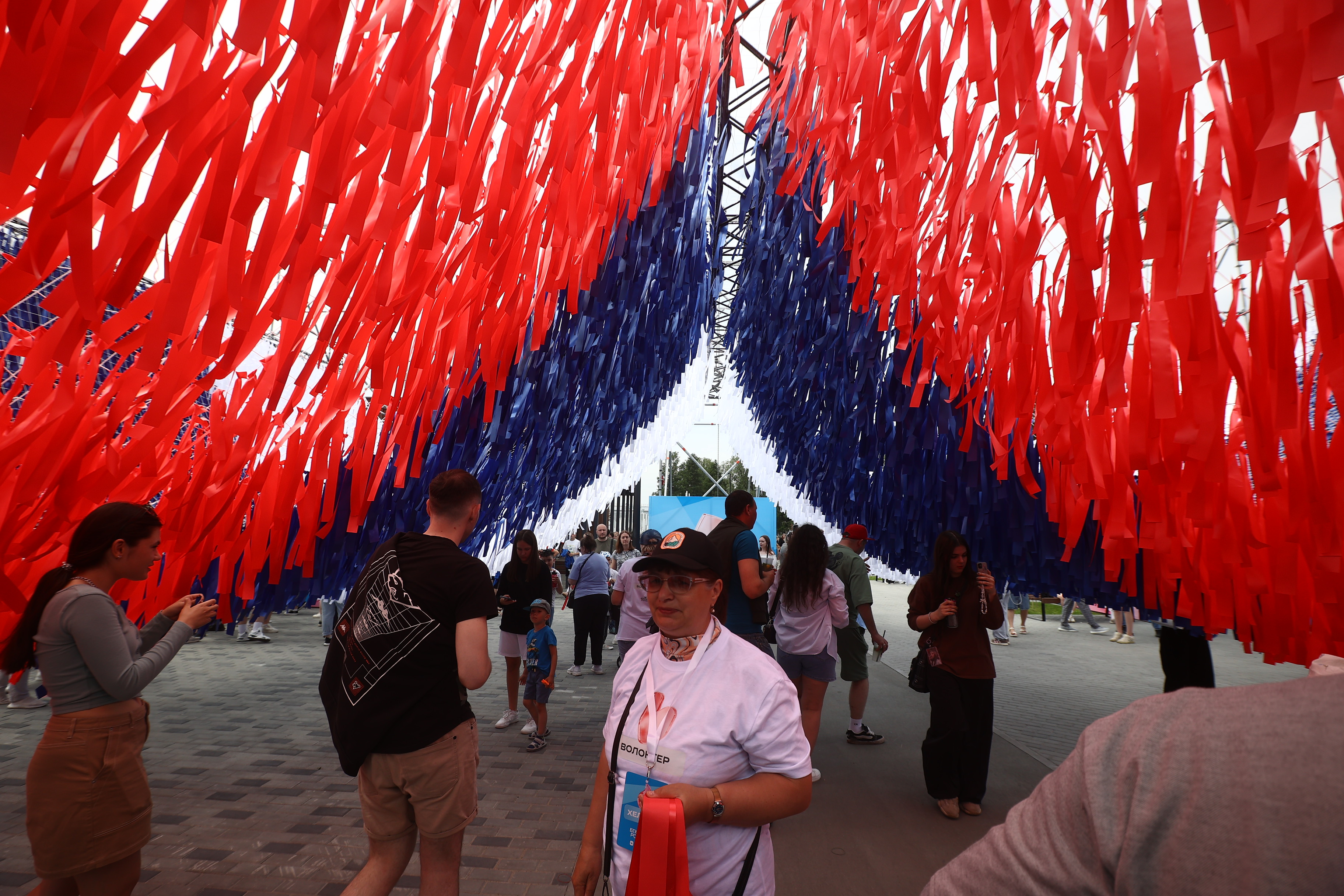 На одной из площадок парка «Арена» разместили гигантскую сеть — основу для флага России. Триколор составляют из ленточек — белых, синих и красных. Важное условие — загадать желание и только потом привязать свою.