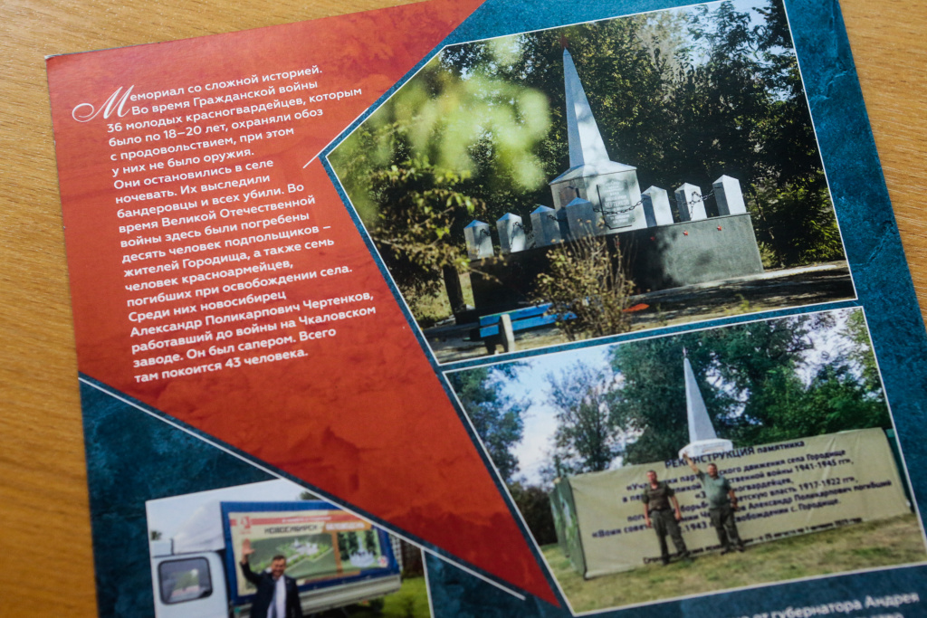 Новосибирцы продолжают восстанавливать инфраструктуру на территориях Донецкой и Луганской Народных Республик. Этим летом бригада гранитчиков из Новосибирска помогла реконструировать мемориал советским бойцам, погибшим в годы Гражданской и Великой Отечественной войн. В память об этом поступке в Новосибирске издали патриотический буклет.