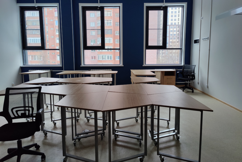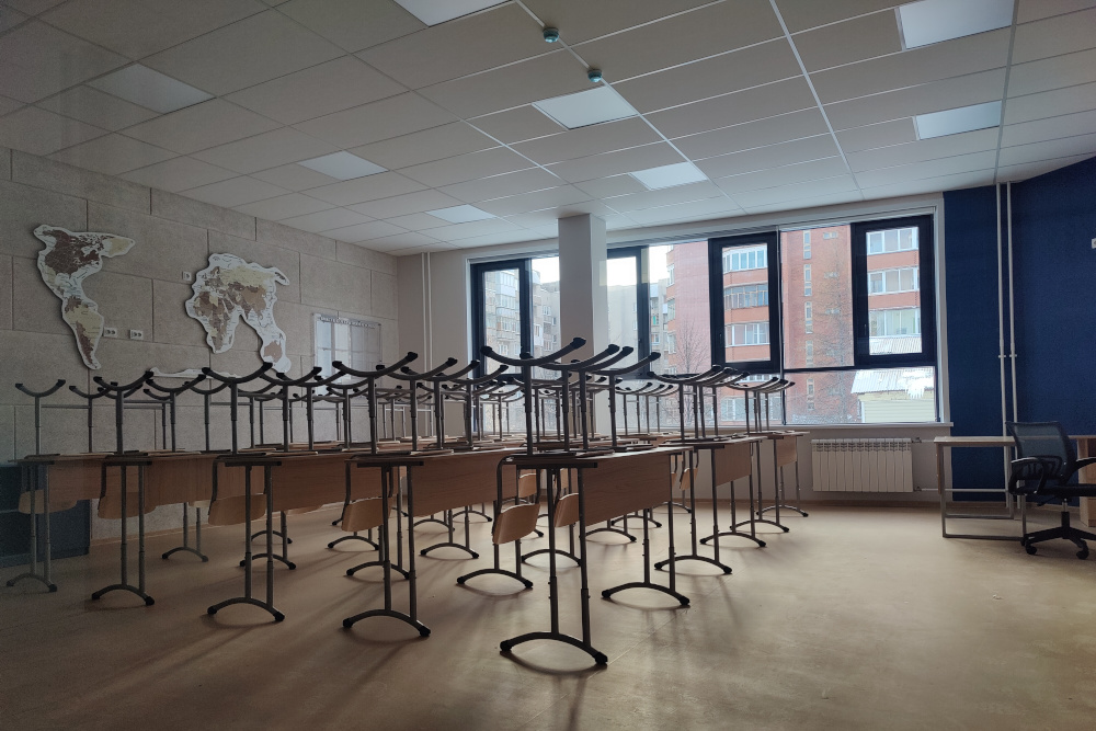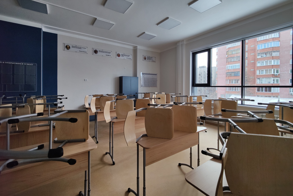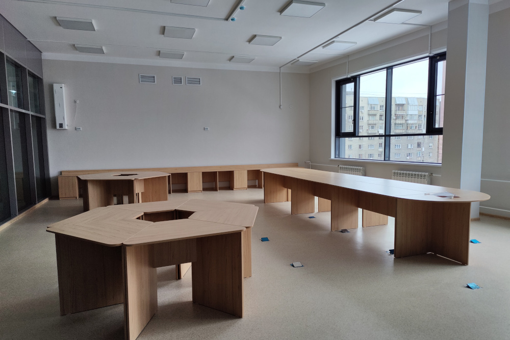 В новый корпус, рассчитанный на 250 учебных мест, переведут старшеклассников. На первом этаже разместили тренажёрный зал с раздевалками, кабинеты химии и биологии с лаборантскими, кабинет социального педагога, медблок и столовую с обеденным залом.