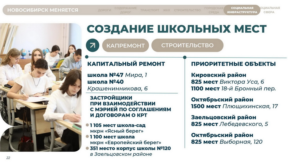 В прошлом году полностью реализовали программу капитального ремонта школ. Модернизировали 21 здание, тем самым дополнительно создали 2644 места. В этом году капремонт начнём в двух школах: №47 на Мира и №40 на Крашенинникова.