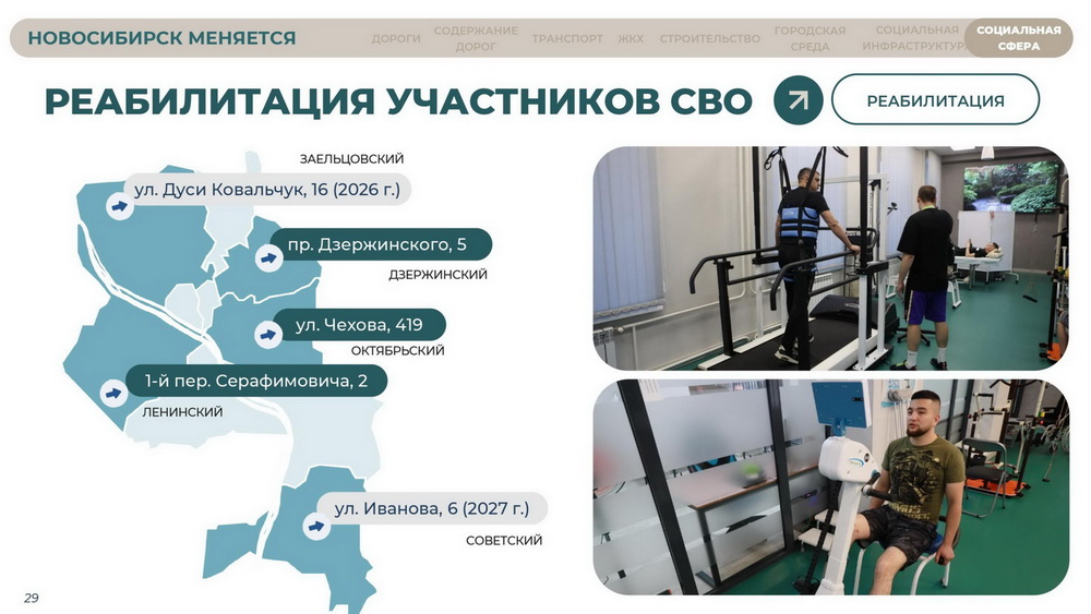 Продолжаем работу по созданию инфраструктуры для социально-медицинской реабилитации участников СВО. Формируем сеть реабилитационных отделений на базе филиалов Городского комплексного центра социального обслуживания населения. Первое учреждение появилось в Ленинском районе в 2023 году. В прошлом году открыто два таких отделения — в Дзержинском и Октябрьском районах. В течение года откроем отделение в Центральном округе, а в 2027 году — в Советском районе.