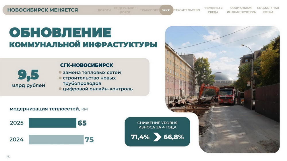 Четвёртый год в Новосибирске реализуется инвестиционная программа по замене теплосетей. За этот период в теплосетевой комплекс города вложено 27 млрд рублей, заменено свыше 230 километров труб. Постепенно снижается степень износа на трубопроводах старше 25 лет.