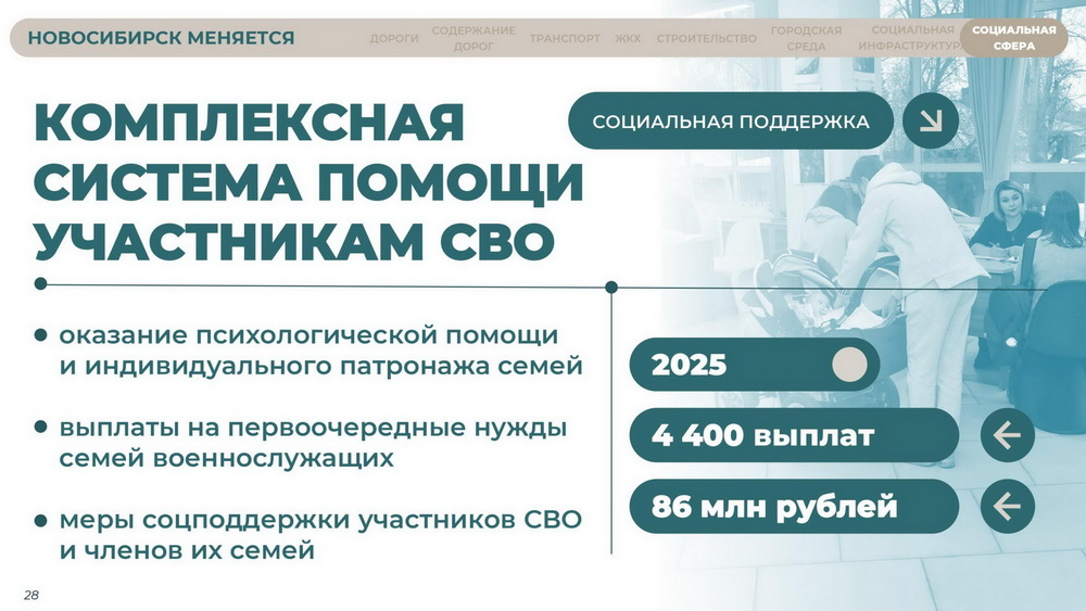 Безусловный приоритет — поддержка военнослужащих и членов их семей. Выстроена комплексная система помощи участникам СВО, каждой семье обеспечивается индивидуальный подход. Работа ведётся в сотрудничестве с правительством Новосибирской области, фондом «Защитники Отечества», воинскими подразделениями. Создана сеть единых координационных центров по сбору помощи бойцам СВО во всех районах города. В ресурсных центрах общественных объединений и помещениях ТОС также действуют пункты сбора помощи.