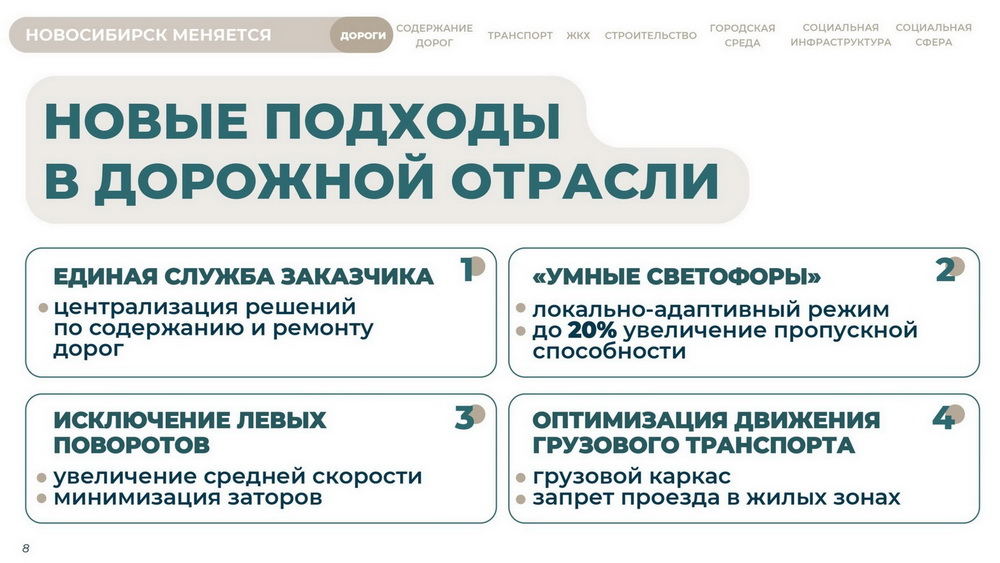 В управлении дорожной отраслью активно внедряем новые подходы и решения. Создаём единую службу заказчика по осуществлению дорожной деятельности на территории города и службу единого муниципального подрядчика. Цель — добиться централизации принятия решений и снизить затраты на содержание и ремонт дорог.