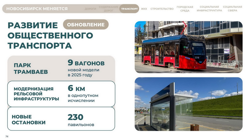 Модернизируем трамвайный парк благодаря предприятию «БКМ Сибирь». В прошлом году девять новых вагонов вышли на 13-й маршрут. Сейчас формируем программу 2026 года. Планируем приобрести несколько единиц.