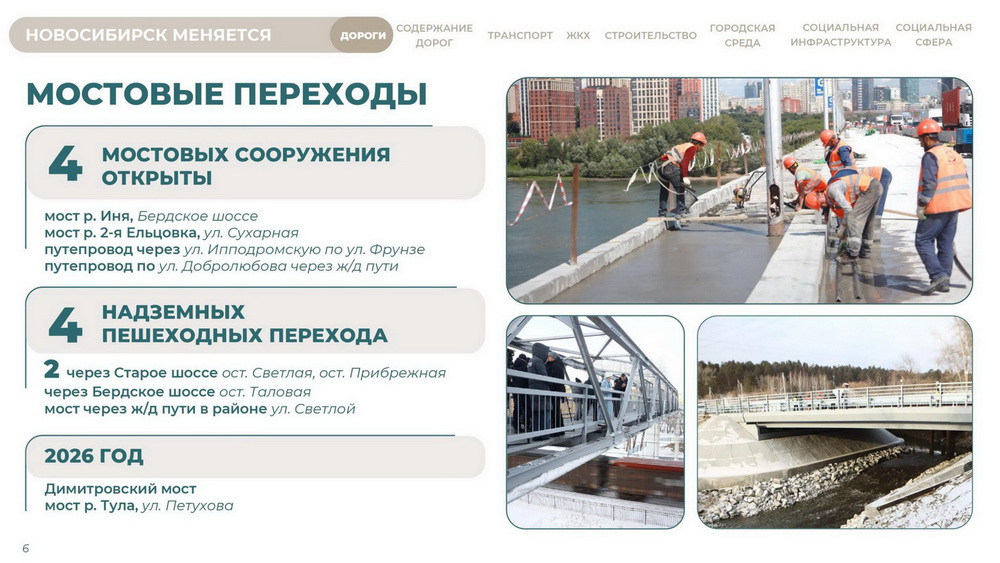 Особенность года — масштабный ремонт мостов и путепроводов с привлечением средств нацпроекта «Инфраструктура для жизни». В работе было шесть мостовых сооружений, из них четыре своевременно введены. По двум объектам продолжим ремонт в этом году. Впервые и успешно была применена практика использования реверсивных полос для организации движения автотранспорта в период ремонта (Димитровский мост и мост через реку Иню на Бердском шоссе). Кроме того, на двух объектах были построены временные мосты на месте разобранных пролётов (на улице Сухарной и реке Туле). Мост через Тулу завершим в этом году, Димитровский — в 2027-м.