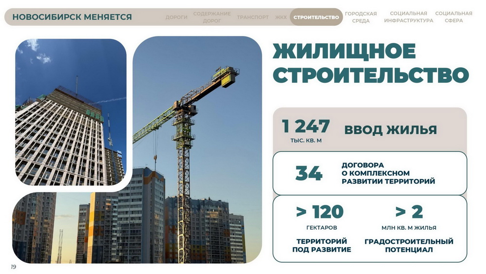 По итогам года введено в эксплуатацию более 1 млн квадратных метров жилья. По соглашениям о комплексном развитии территорий застройщики в дополнение к новому жилью возводят школы и детские сады, создают парки и прокладывают дороги. За счёт этого развивается социальная инфраструктура.