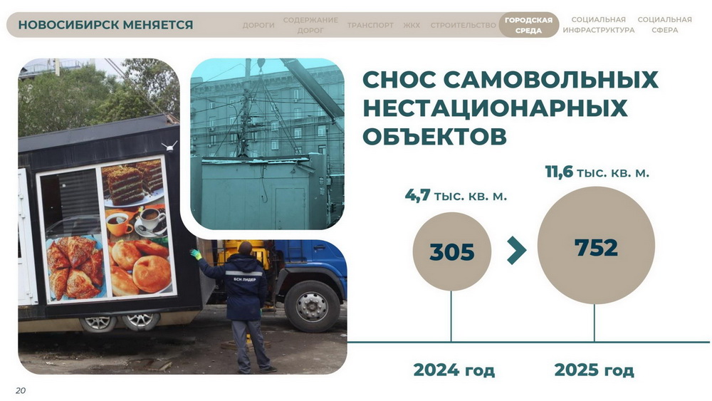 Наводим порядок в отношении незаконных нестационарных объектов, которые вызывают справедливые нарекания жителей. В 2025 году было демонтировано более 750 таких сооружений, что в два раза превышает показатели предыдущего года. В этом году работа будет продолжена. Готовы убирать с улиц города и нестационарные объекты, которые не соответствуют установленному архитектурному облику. Средства на это предусмотрены.