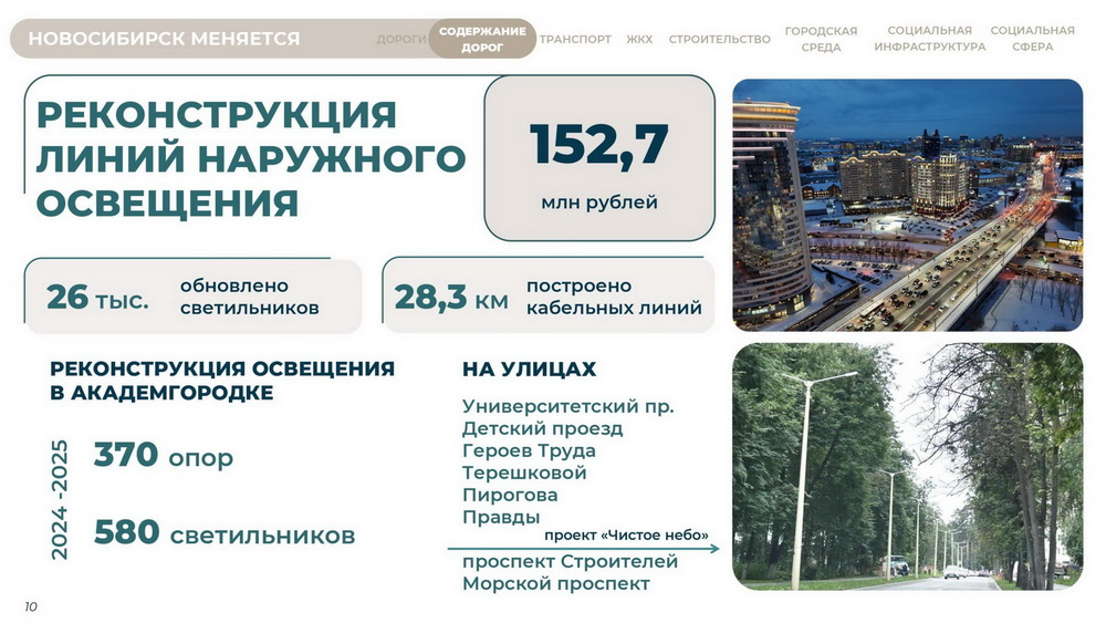На реконструкцию сетей наружного освещения было выделено 152,7 млн рублей. Важный проект выполнен в Академгородке, где на двух улицах реализован пилотный проект «Чистое небо». В этом году продолжаем модернизацию линий наружного освещения с заменой светильников на светодиодные на ключевых магистралях и приступаем к строительству новых линий.