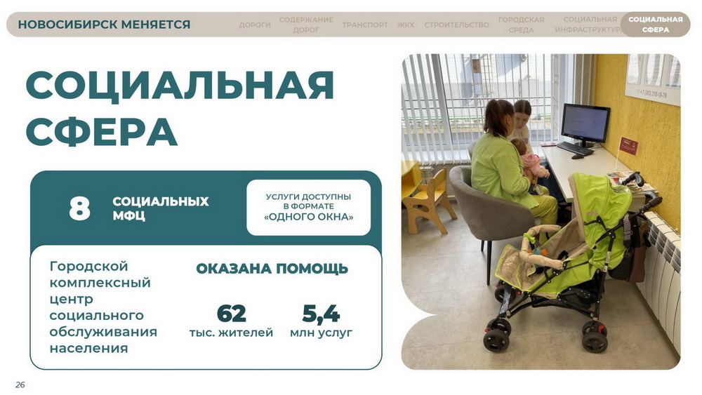 Важные задачи решаем в социальной сфере. Реализуются мероприятия по повышению качества социального обслуживания и доступности необходимых услуг. В приоритете — формирование бесшовных межведомственных маршрутов оказания помощи. В прошлом году на базе филиалов Городского комплексного центра в разных районах города открылись восемь социальных МФЦ. Услуги доступны в формате «одного окна».