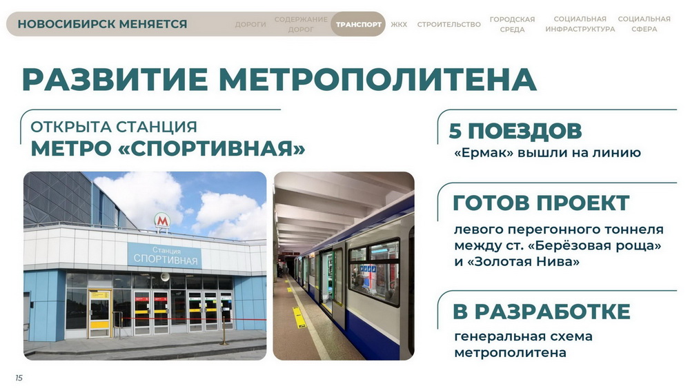 Прошлый год стал прорывным в части развития новосибирского метрополитена. Работа велась сразу в нескольких направлениях. Впервые за 15 лет открыта новая станция — «Спортивная», возле которой планируем развивать транспортно-пересадочный узел с конечной остановкой для городских и пригородных маршрутов. Это позволит перераспределить потоки транспорта и разгрузить площадь Маркса, «Студенческую» и район областной больницы.