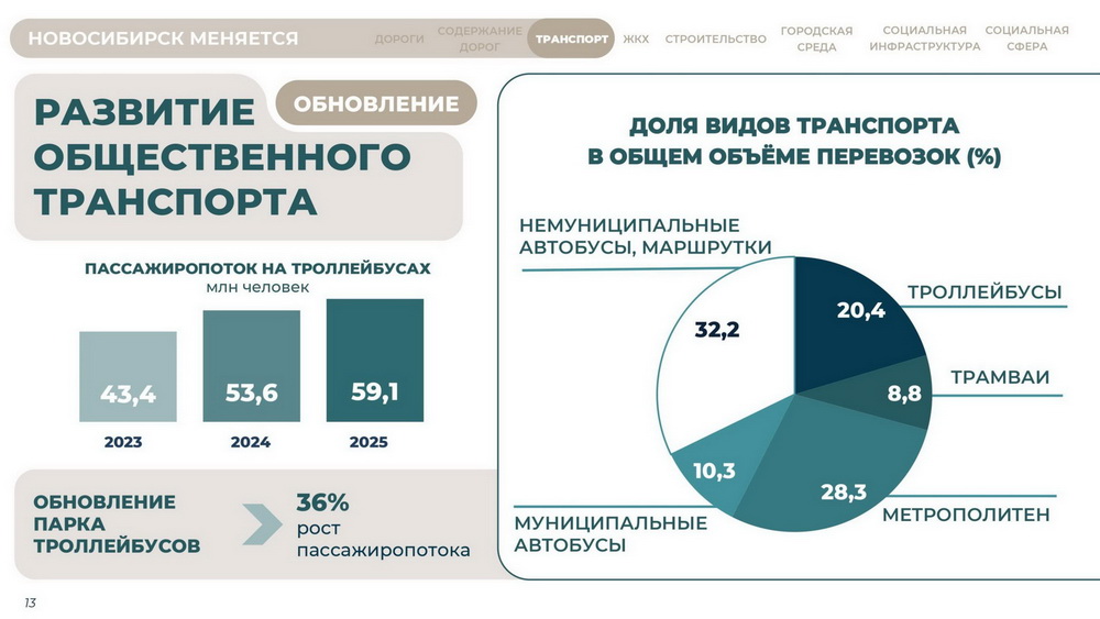 Мы приобрели 258 низкопольных троллейбусов марки «Горожанин» с автономным ходом. Совместными усилиями города и области троллейбусный парк обновлён на 80%, перспективная задача — довести эту цифру до 100%. По мере возможностей бюджета будем закупать новые троллейбусы. С 2023 по 2025 год на этом виде транспорта зафиксирован рост паcсажиропотока на 36%.