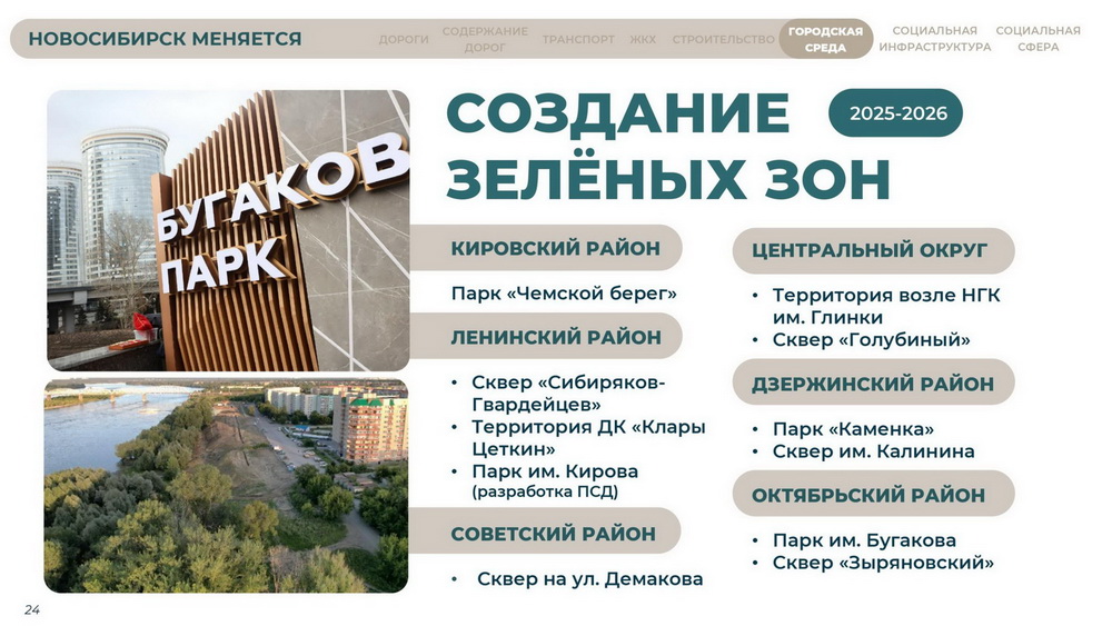 На особом контроле — реализация мероприятий в рамках национального проекта «Инфраструктура для жизни», а также государственных и муниципальных программ. В прошлом году обновили десять парков и скверов в разных районах города (объекты на слайде).