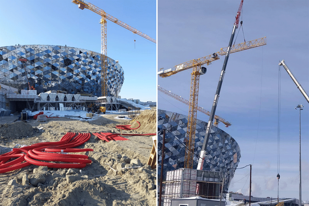 Параллельно подрядчик ООО «ЭлинАльфа» заканчивает работы на кровле основного здания и демонтирует грузоподъёмные механизмы. Снаружи и внутри проводят электрику, канализацию, вентиляцию и слаботочные системы. В VIP-зоне завершают монтаж витражей, в главном зале продолжают возводить перегородки.