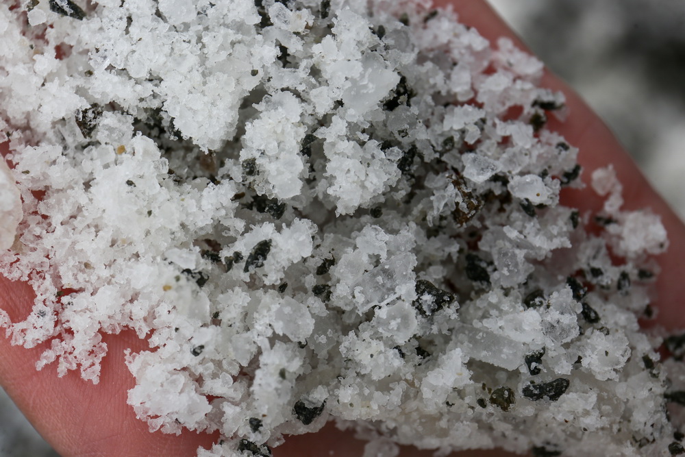 Соль в составе смеси — специальная, дорожная. Попадаются крупные кристаллики. Что касается песка — он крупный: отсев горных пород. Когда этот противогололёдный состав будут высыпать на дороги Новосибирска, пылить не должно.
