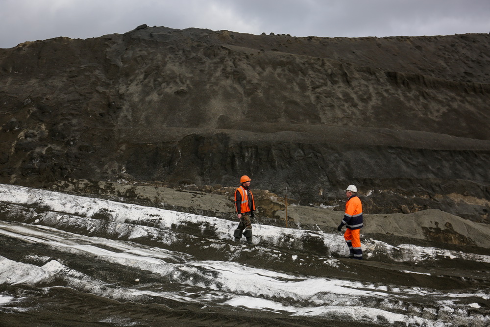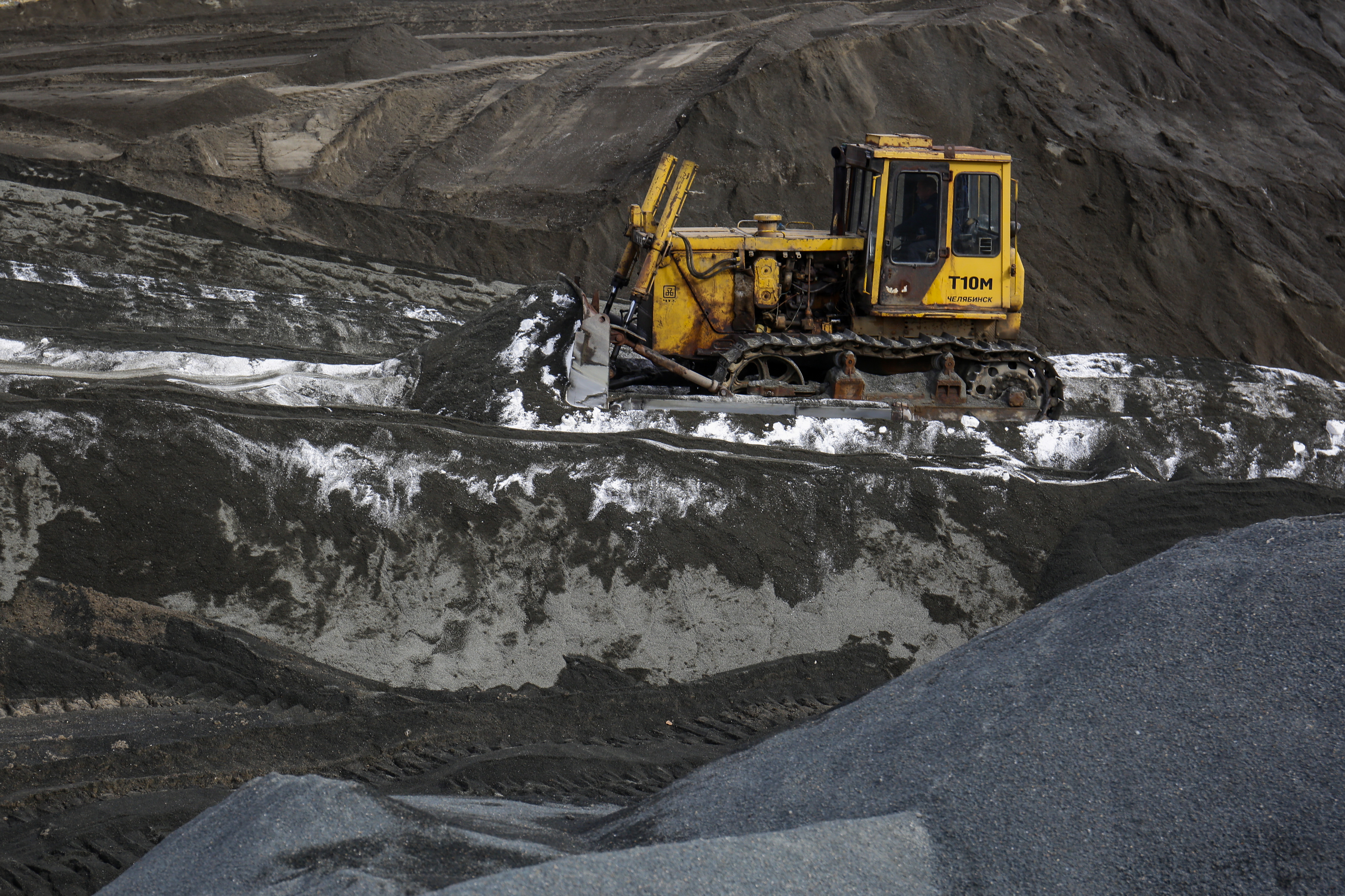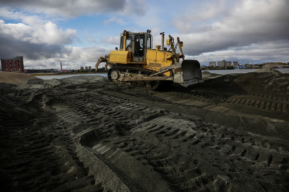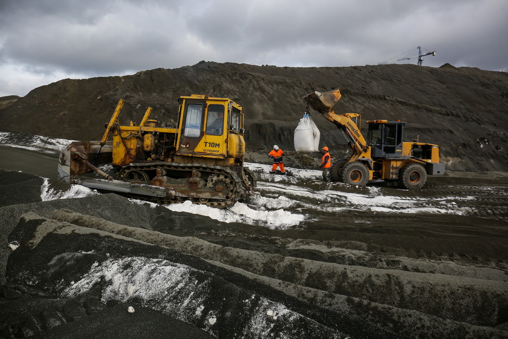 На пескобазе ДЭУ-1 начали заготовку противогололёдной смеси. На фоне тёмной горы песка — небольшое количество белой соли. Это связано с пропорцией зимнего дорожного коктейля — одна часть соли и девять частей крупного песка.