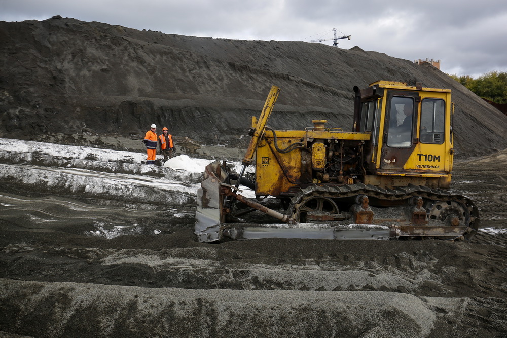 Пока что ингредиенты смешивают, утрамбовывают гусеничной техникой. Важно, чтобы состав был однородным. Именно тогда он поможет на дороге зимой.
