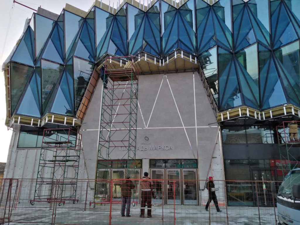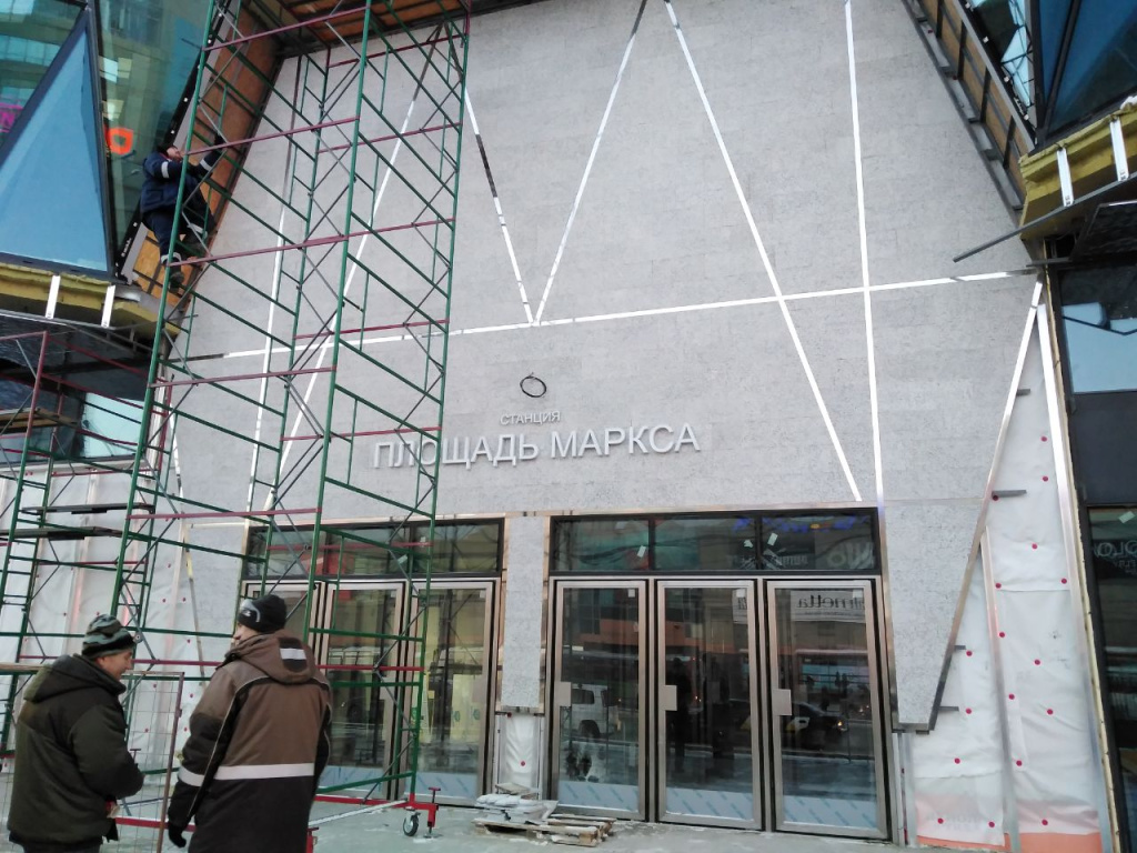 На площади Маркса завершают строительство торгового центра «Грани». С выходом из метро №4 его соединили 27-метровым подземным тоннелем, а на первом этаже обустроили фойе. На северном фасаде здания над входными дверями смонтировали вывеску «Станция „Площадь Маркса“». Кроме того, рядом с ТЦ разместили два остановочных навеса для пассажирского транспорта.