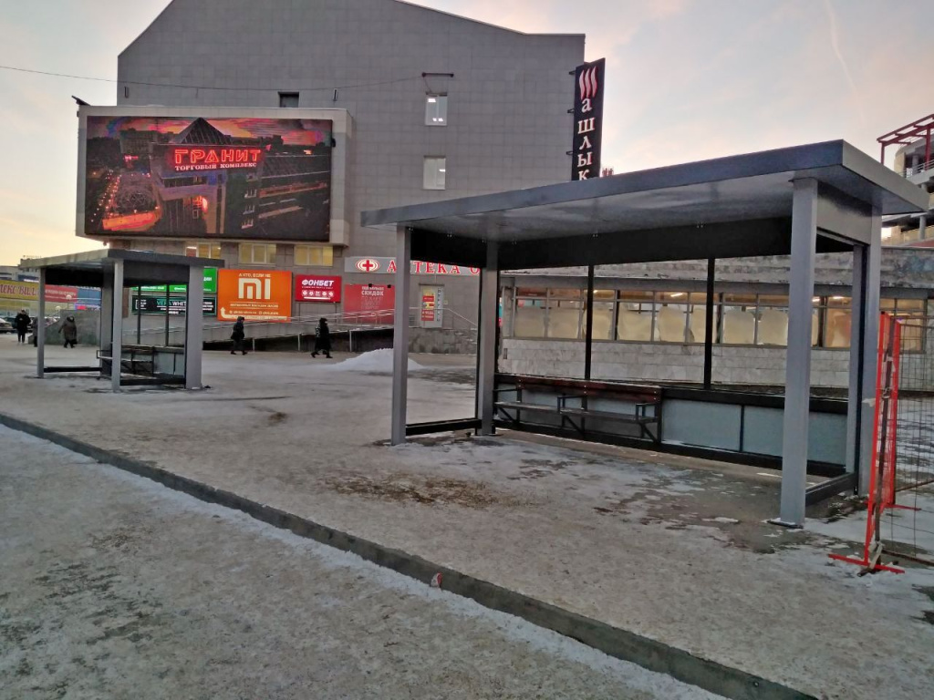 Рядом со входом в метро разместили два остановочных павильона-навеса для общественного транспорта.