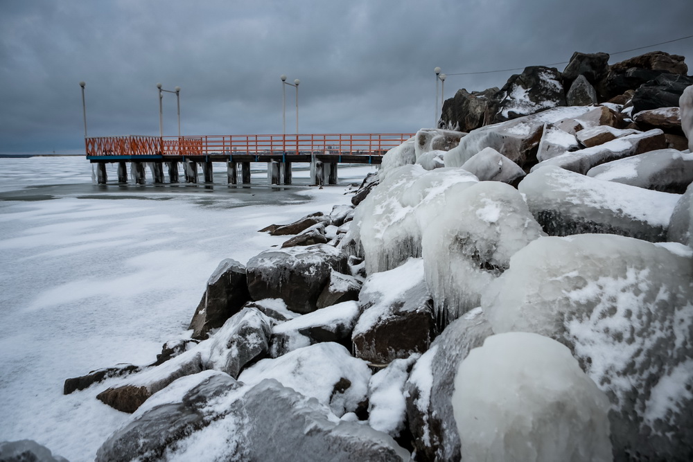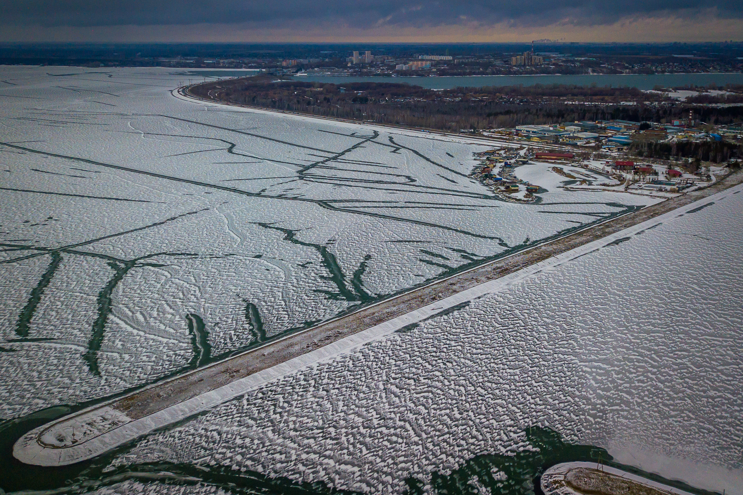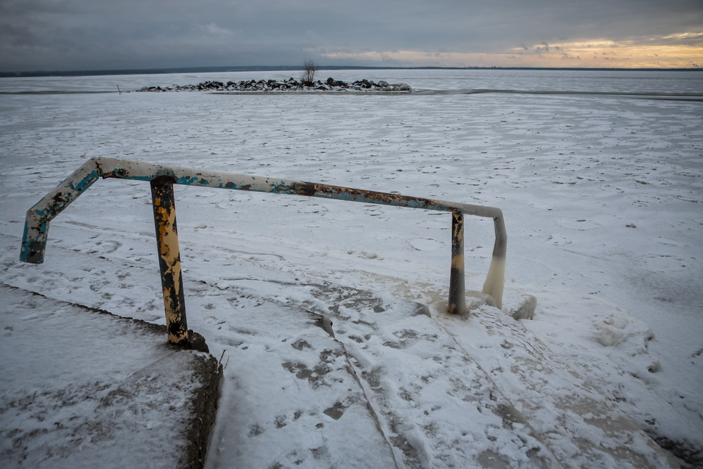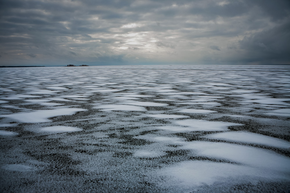 Как правило, к концу ноября толщина льда на водохранилище достигает 20-25 см. В этом году из-за аномально тёплой осени ледовая корка гораздо тоньше. Её слегка припорошило снегом, а ветра создали из него затейливый узор.