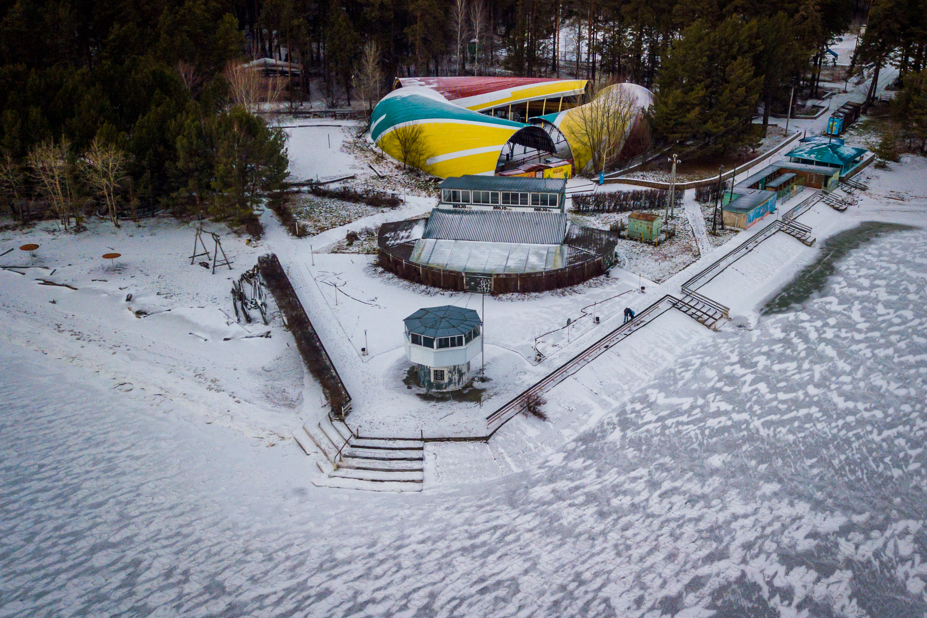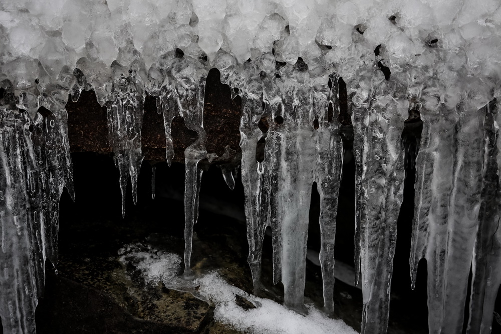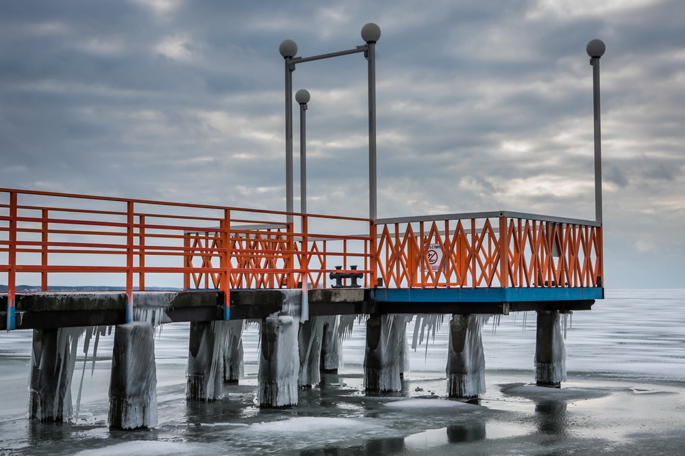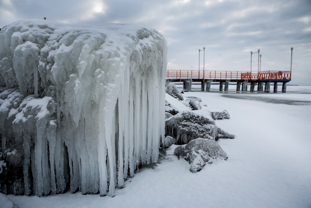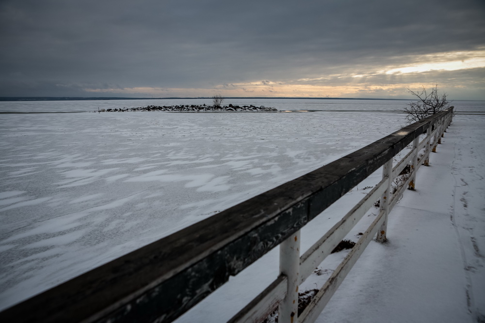 Как правило, к концу ноября толщина льда на водохранилище достигает 20-25 см. В этом году из-за аномально тёплой осени ледовая корка гораздо тоньше. Её слегка припорошило снегом, а ветра создали из него затейливый узор.