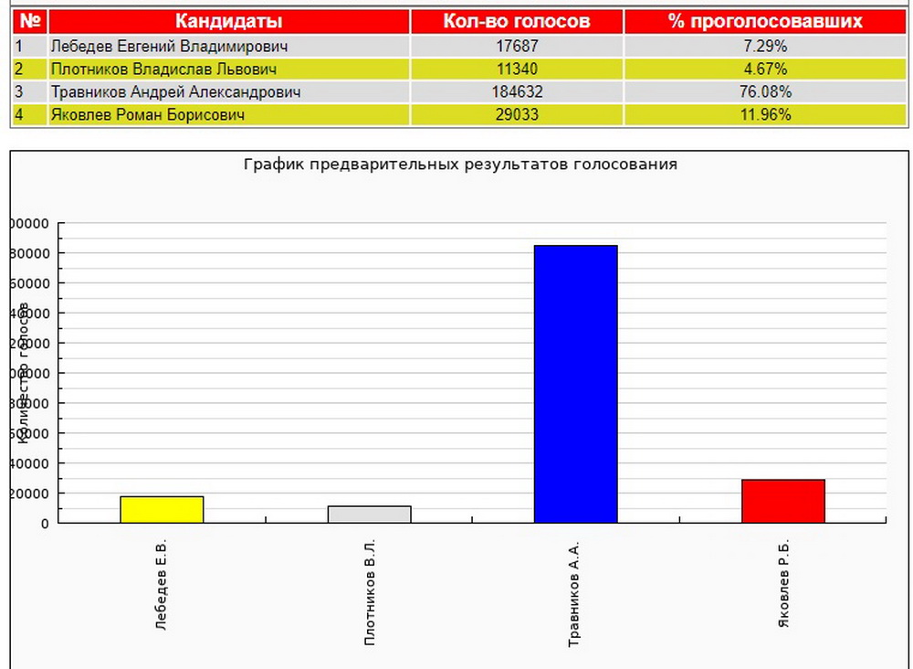 К 23:00 обработано 510 протоколов участковых комиссий из 1084. Протокол ДЭГа уже получен. По итогам электронного голосования Евгений Лебедев получил 8750 голосов избирателей, Владислав Плотников — 4078, Андрей Травников — 54 585, Роман Яковлев — 8761.