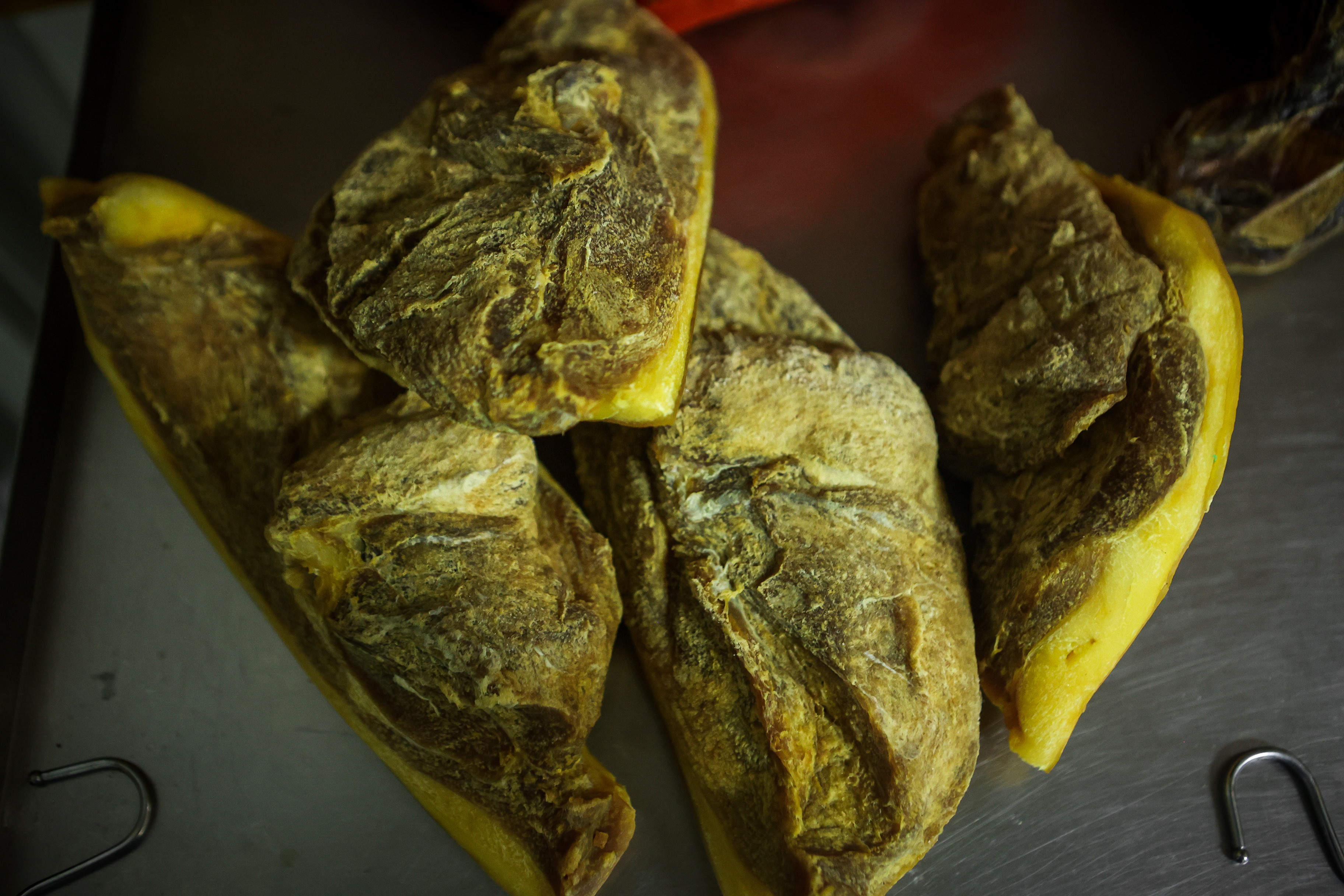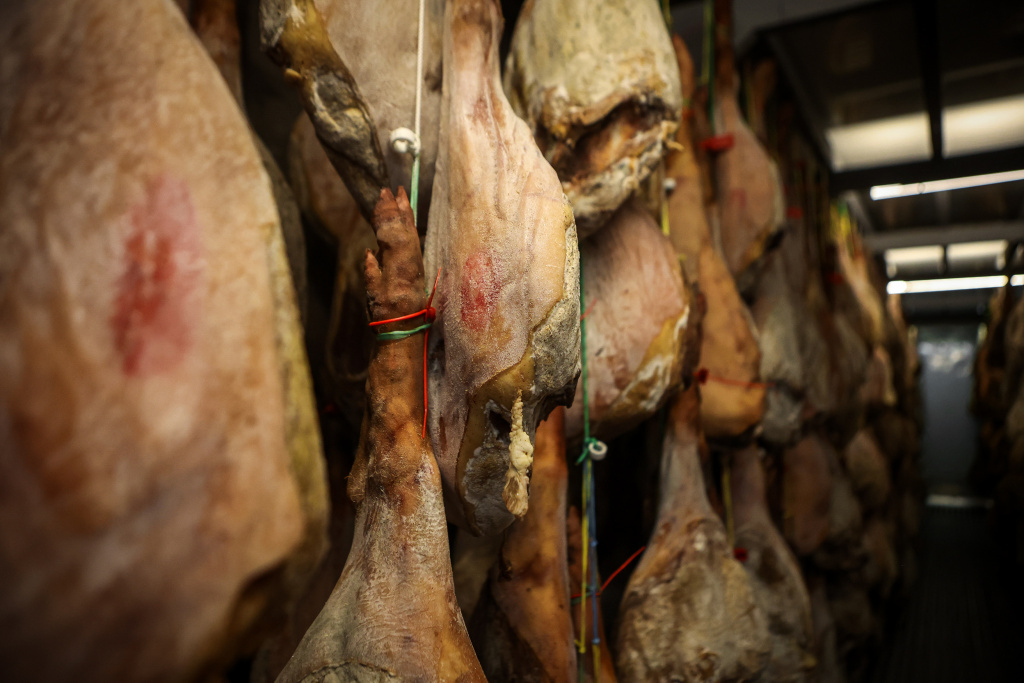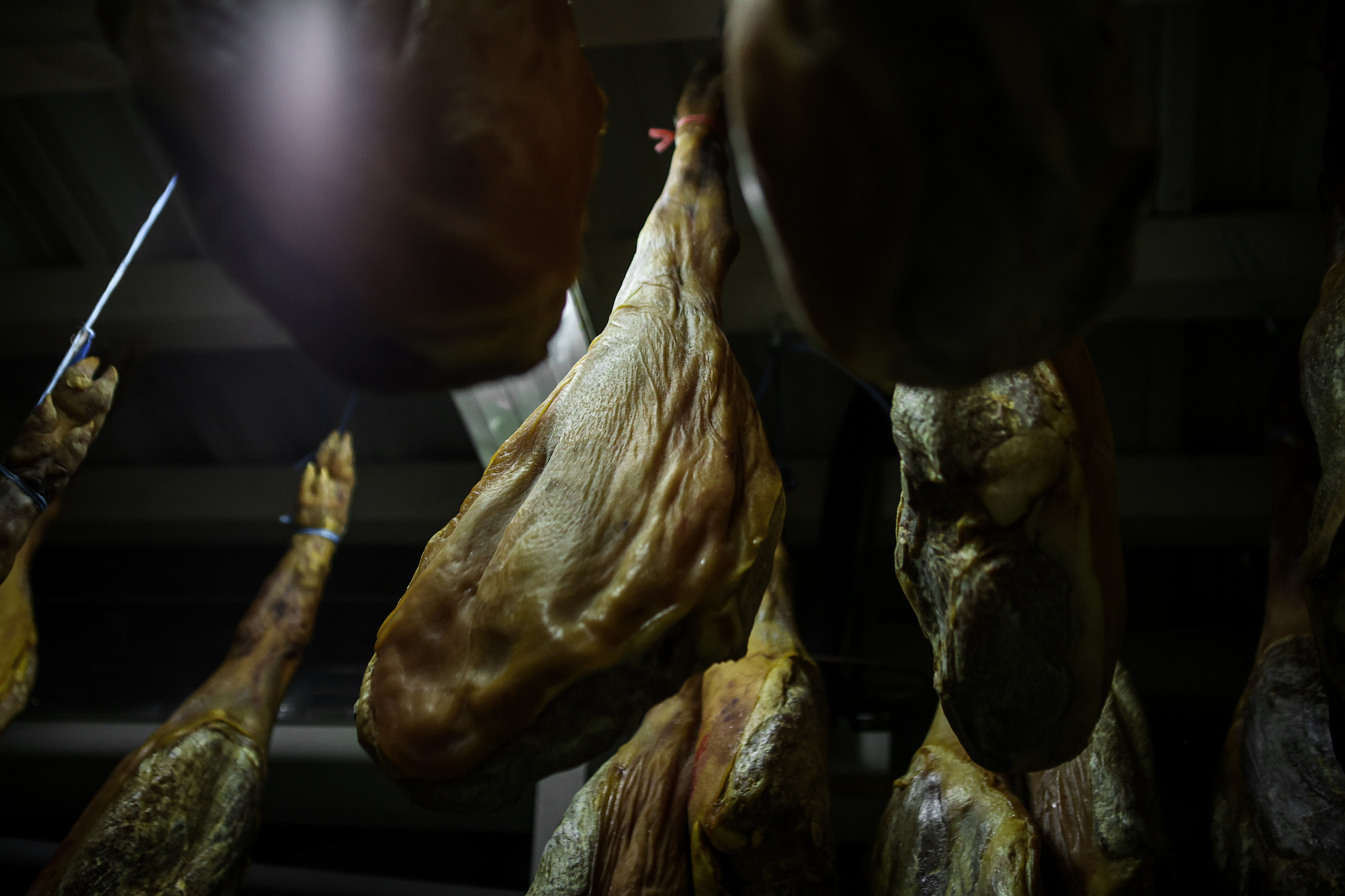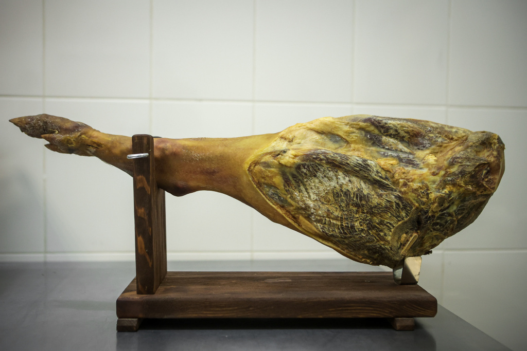 За год хамон проходит несколько климатических камер с заданной температурой и влажностью. Жир и шкура снаружи окорока служат защитной оболочкой для внутренних процессов ферментации.