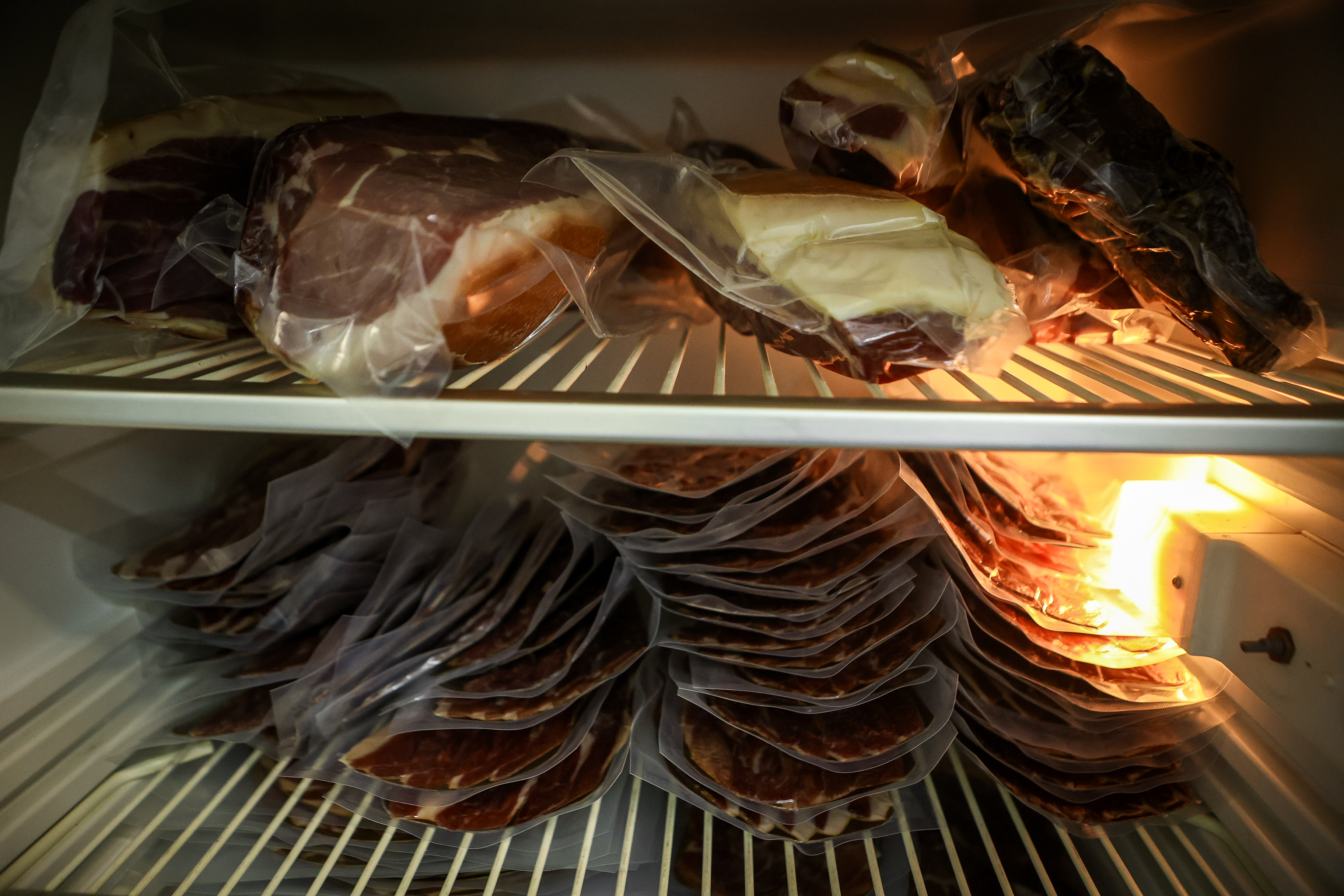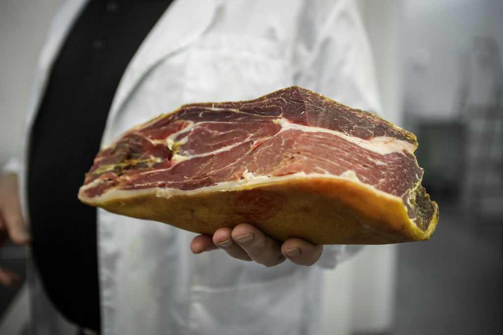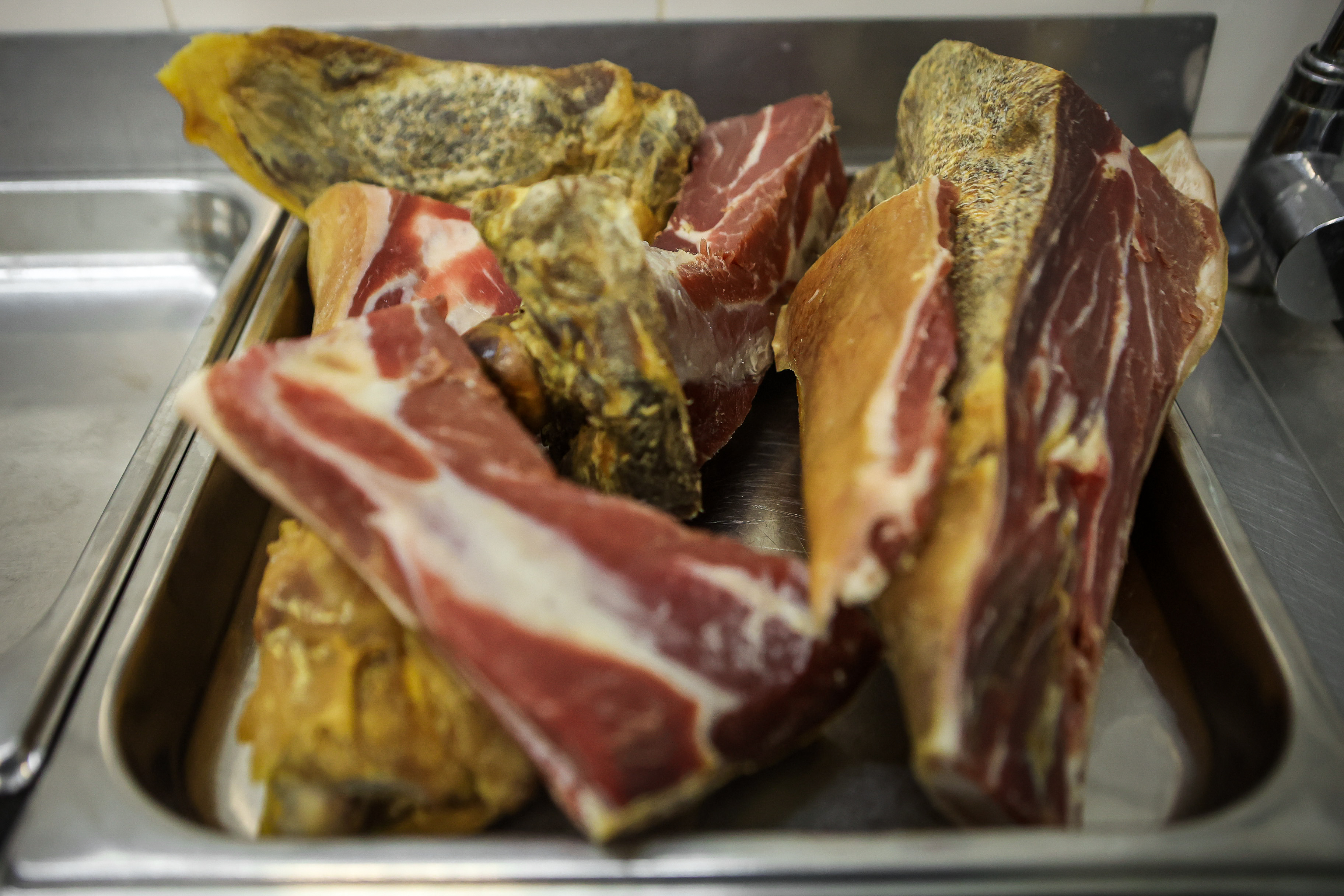 За год хамон проходит несколько климатических камер с заданной температурой и влажностью. Жир и шкура снаружи окорока служат защитной оболочкой для внутренних процессов ферментации.